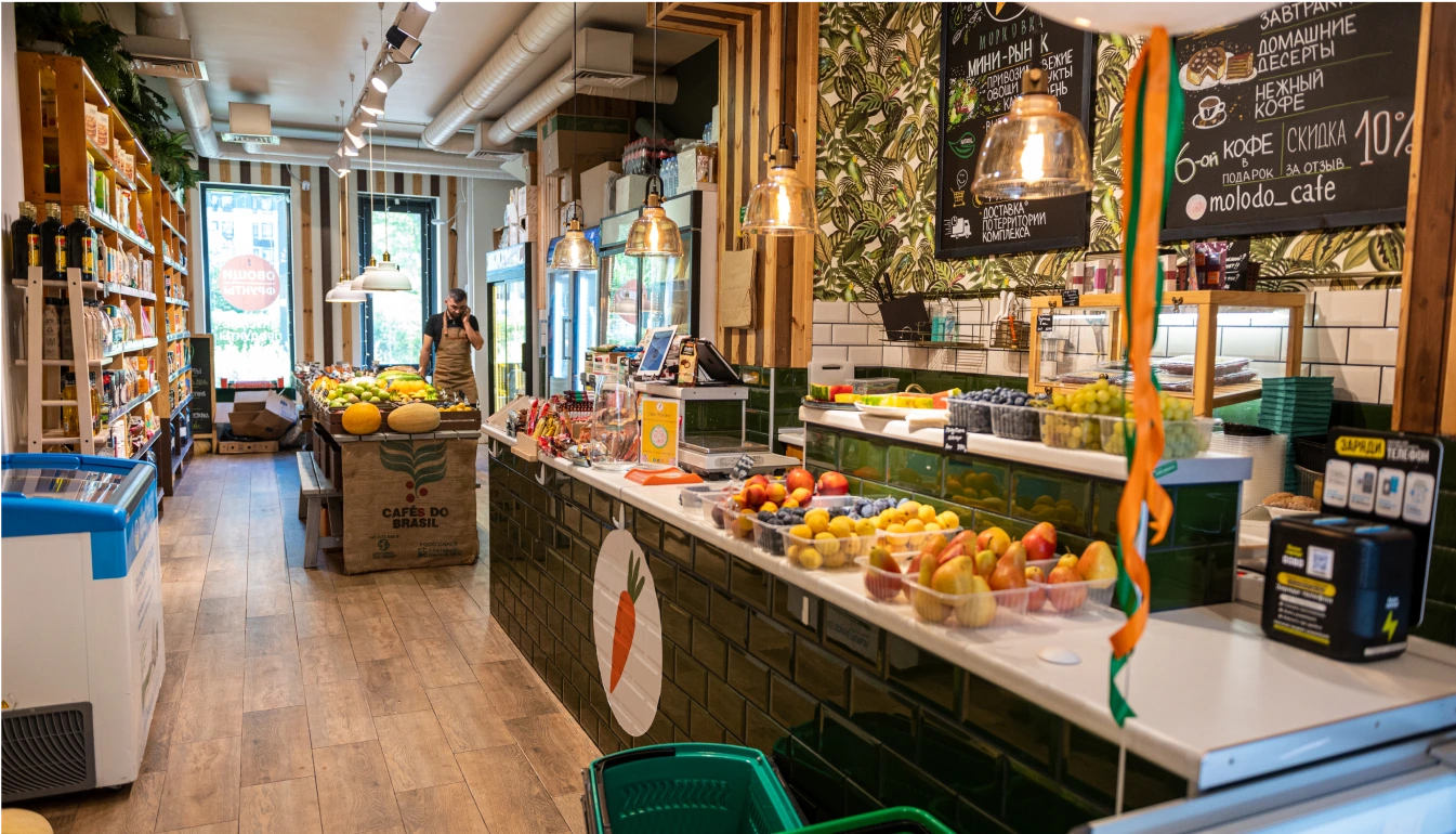 Открыть лавку и кафе в одном помещении было не только эмоциональным решением, но и рациональным. Мне было важно, чтобы продукты в лавке всегда были свежими, вкусными и красивыми. Но овощи и фрукты не всегда быстро раскупают, и на них могут появиться небольшие помятости. Если бы не было кафе, то пришлось бы торговать такими или списывать. А так как кафе есть, то повара каждый день забирают на кухню фрукты и овощи, которые выглядят наименее привлекательно. Таким образом списания в лавке получаются минимальные — до 10%. Знаю, что в некоторых магазинах они могут доходить до 20% — это очень много.