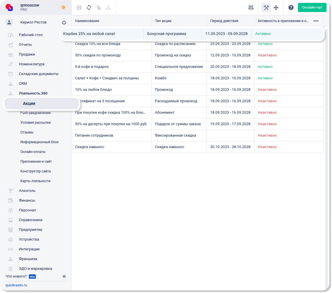 Все бонусные программы, созданные в разделе бэк-офиса CRM — Бонусные программы, отображаются также и в разделе Лояльность.360 — Акции.