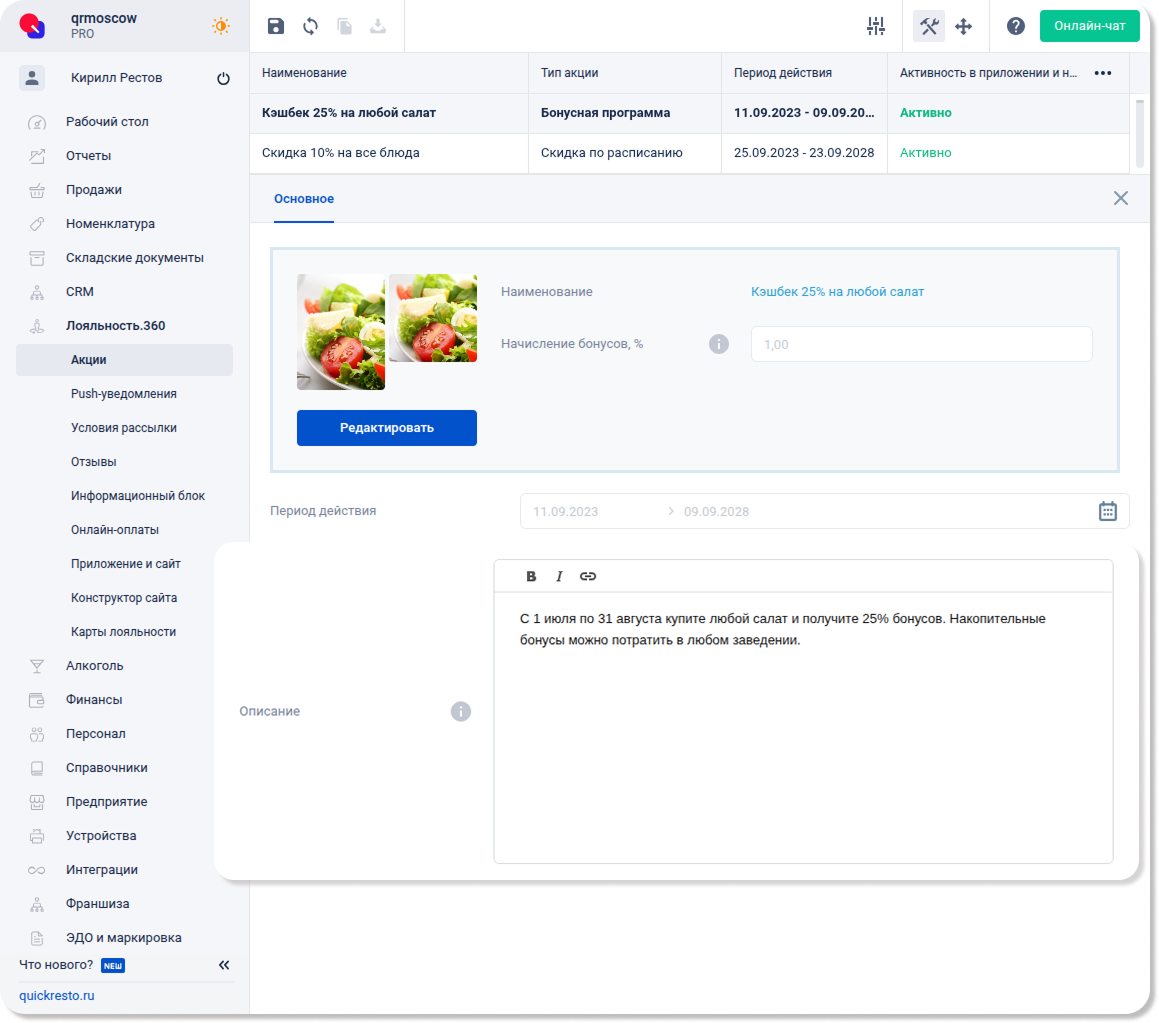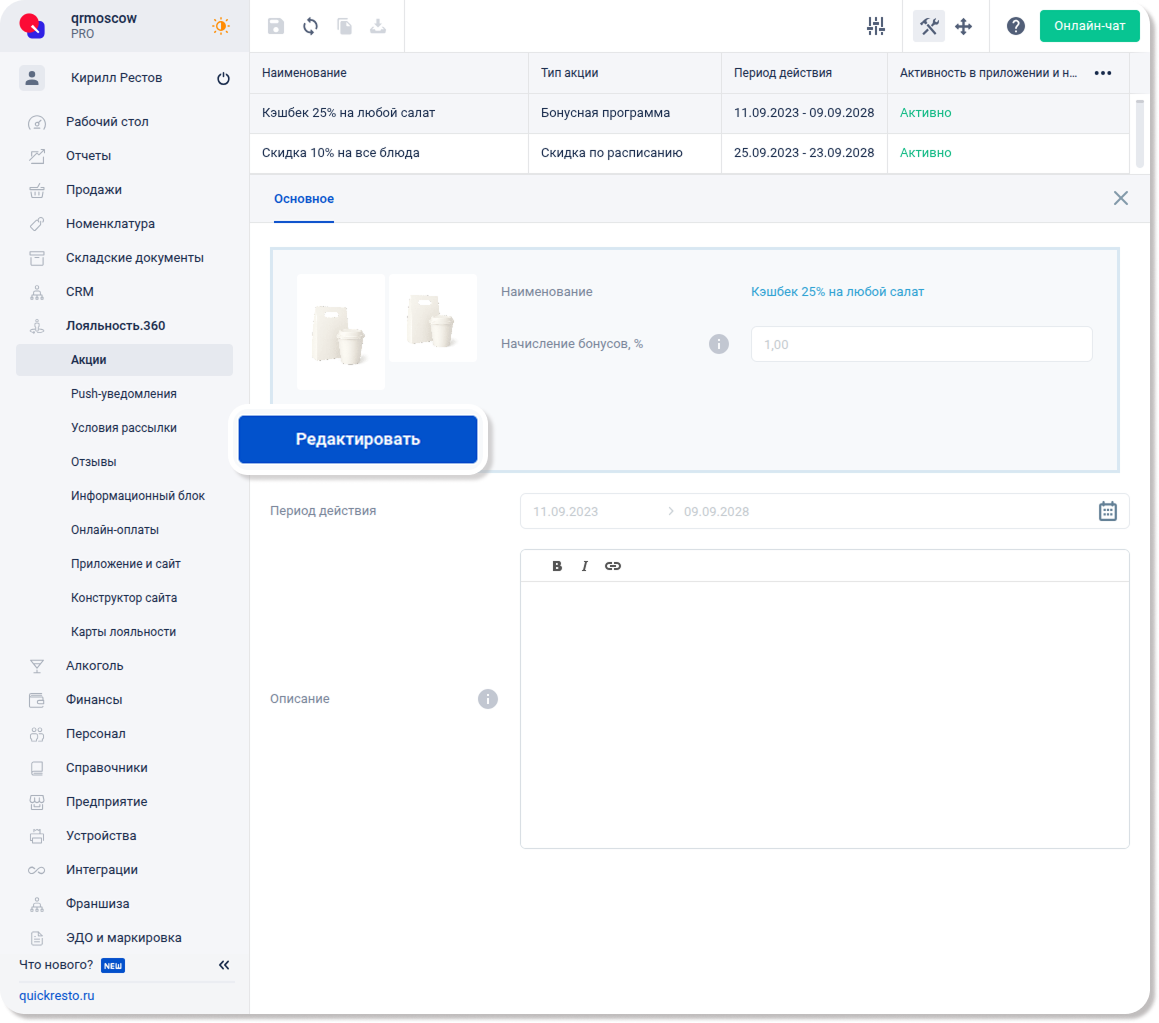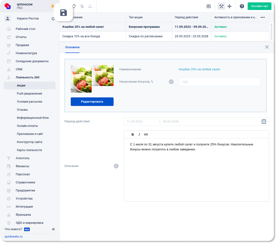 Для этого создайте бонусную программу в разделе CRM, затем перейдите в раздел Лояльность.360 — Акции и выполните следующие действия: