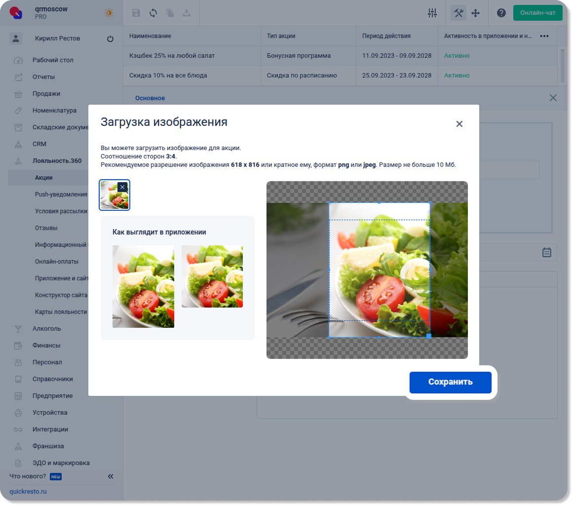 4. Когда изображение загрузится, вы сможете увидеть и отредактировать, как оно должно отображаться в приложении для гостей. После этого нажмите на кнопку Сохранить.