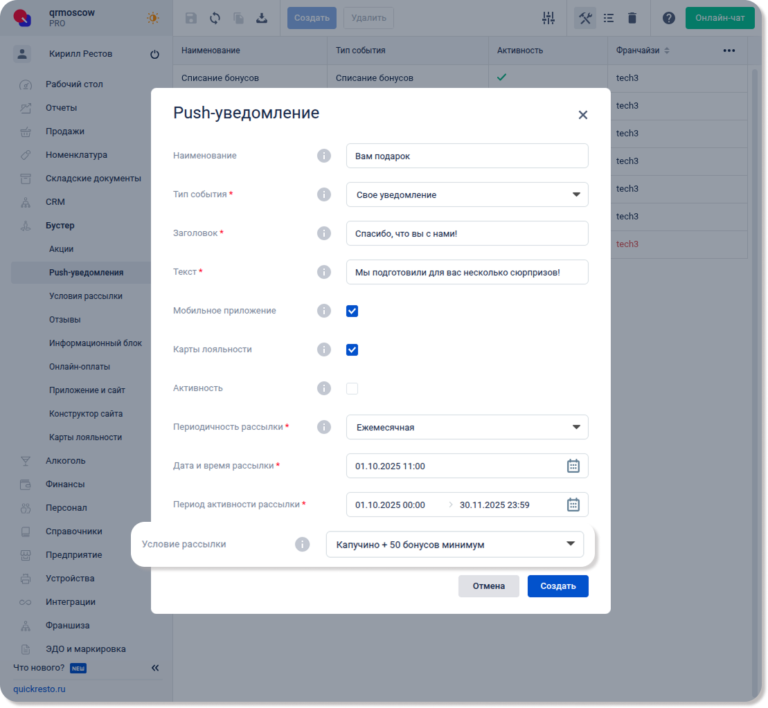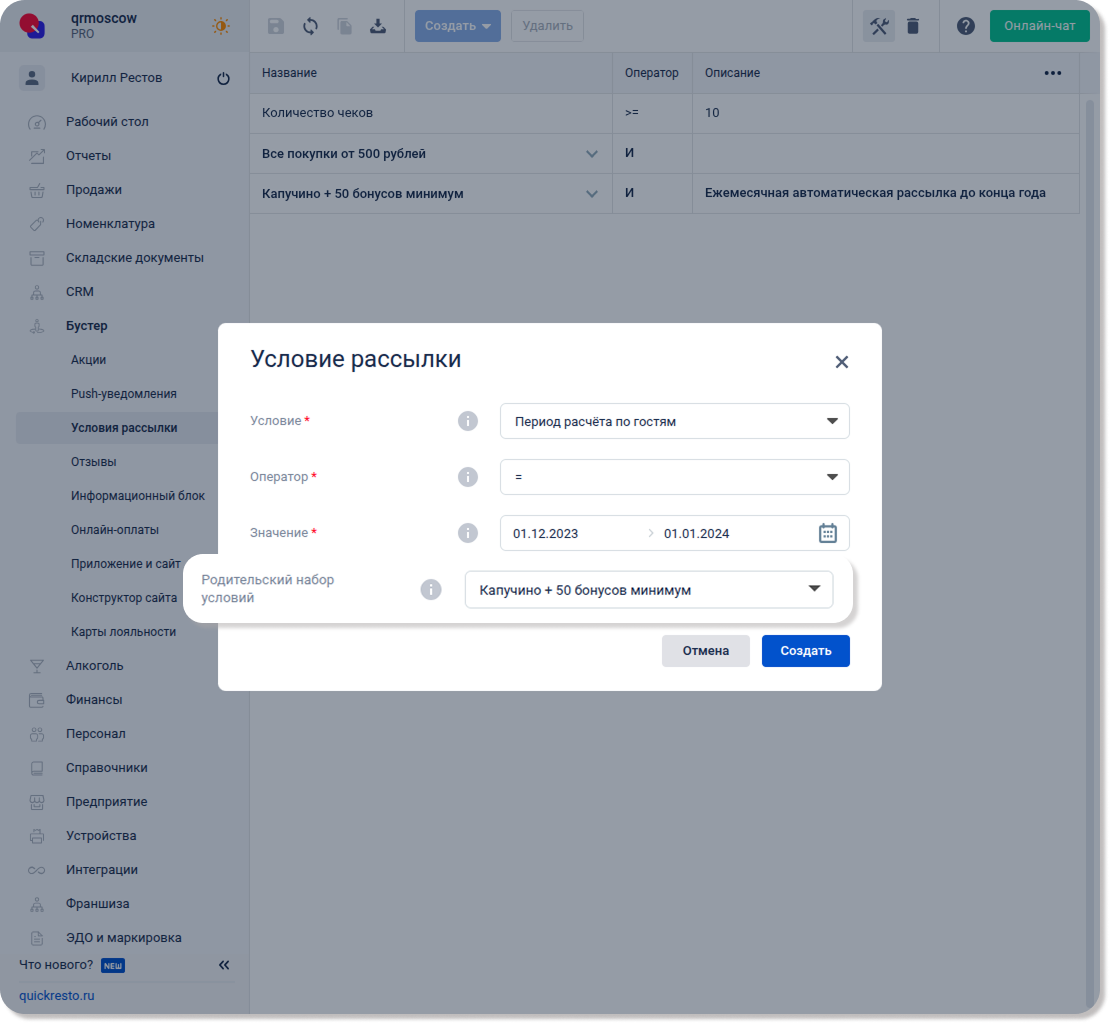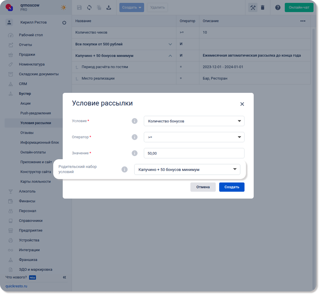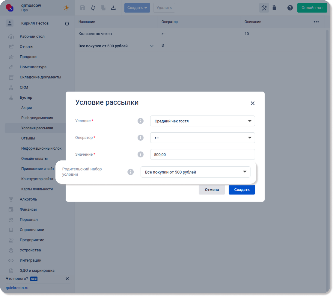 Перейдите в раздел Бустер — Условия рассылки, нажмите Создать и выберите Условие рассылки.