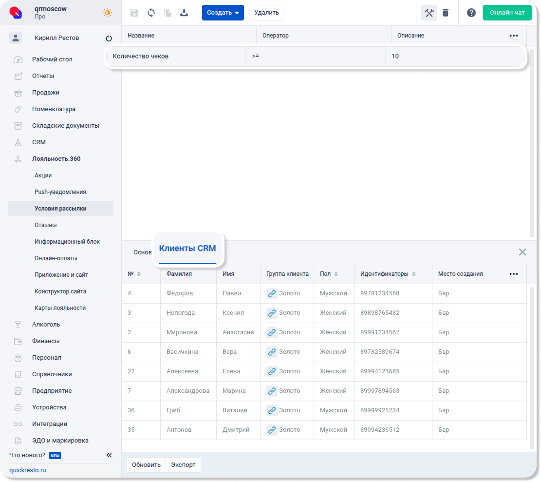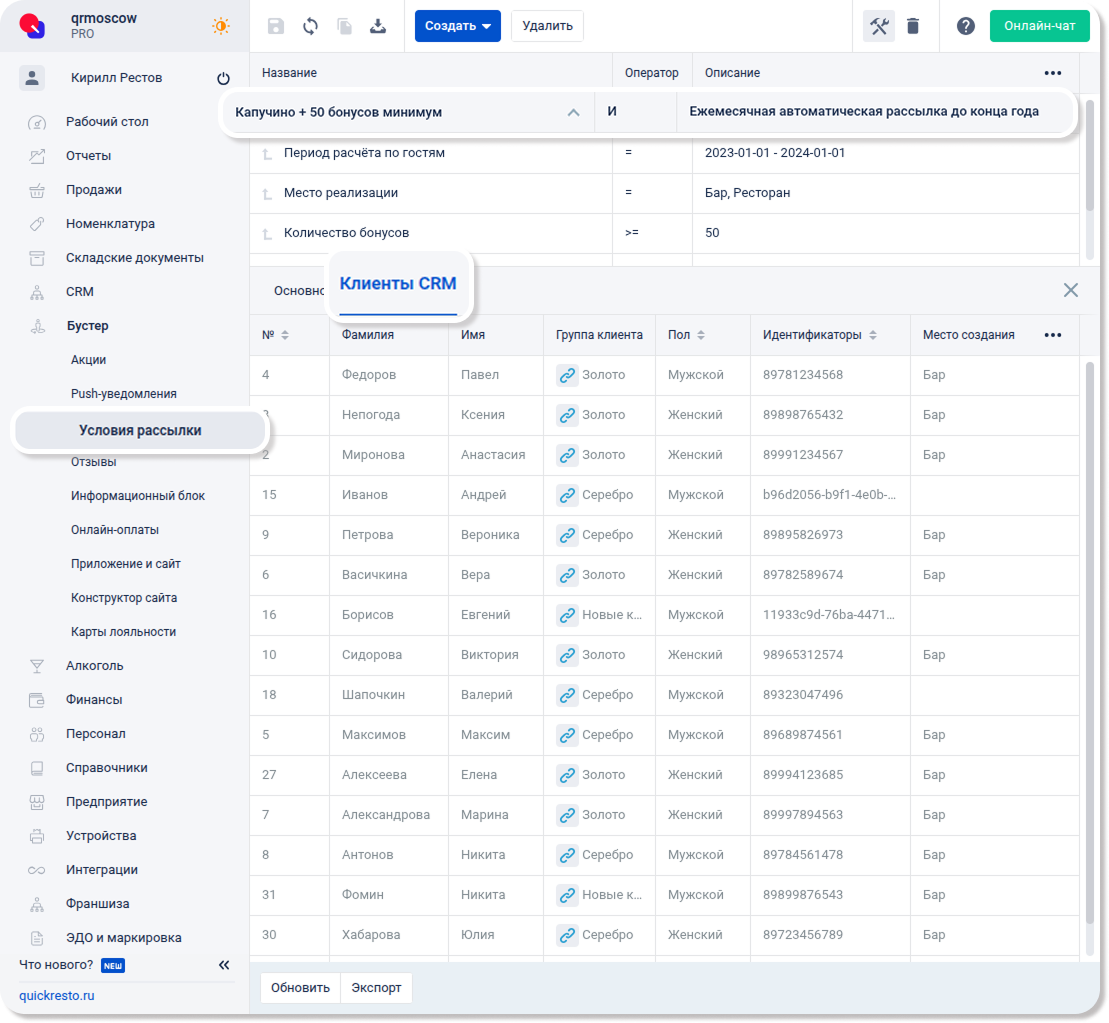 На вкладке Клиенты CRM в параметрах набора условий можно просмотреть клиентов, которые удовлетворяют данному набору и получат уведомление при рассылке с ним.