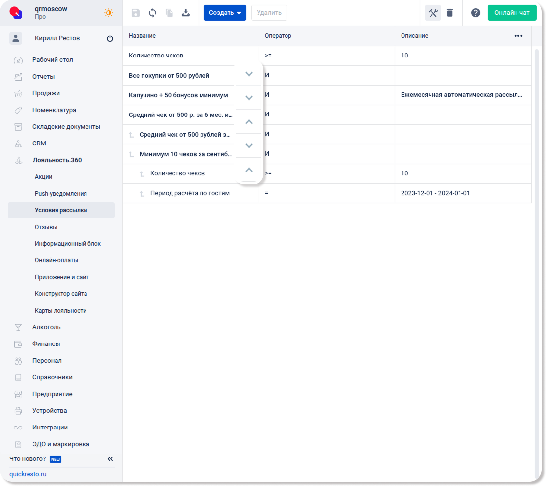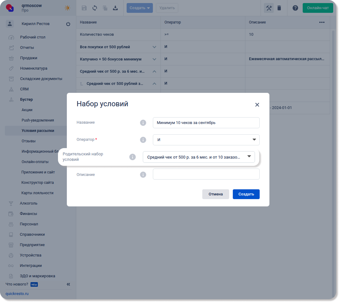 Набор для рассылки гостям со средним чеком за полгода от 500 ₽ и количеством чеков за сентябрь от 10 будет готов. С помощью стрелок в названиях наборов можно просмотреть, какие условия и наборы условий вложены в них.