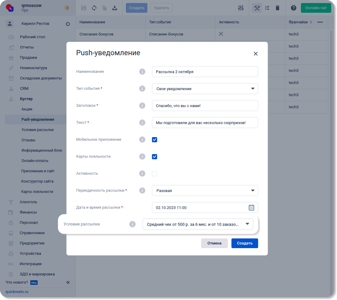 Затем, чтобы отправить уведомление с этими условиями рассылки, переходим в раздел Бустер — Push-уведомления, создаем новое уведомление и указываем в его параметрах набор, который мы создали. Подробнее о создании и отправке уведомлений.