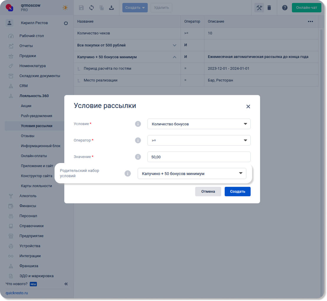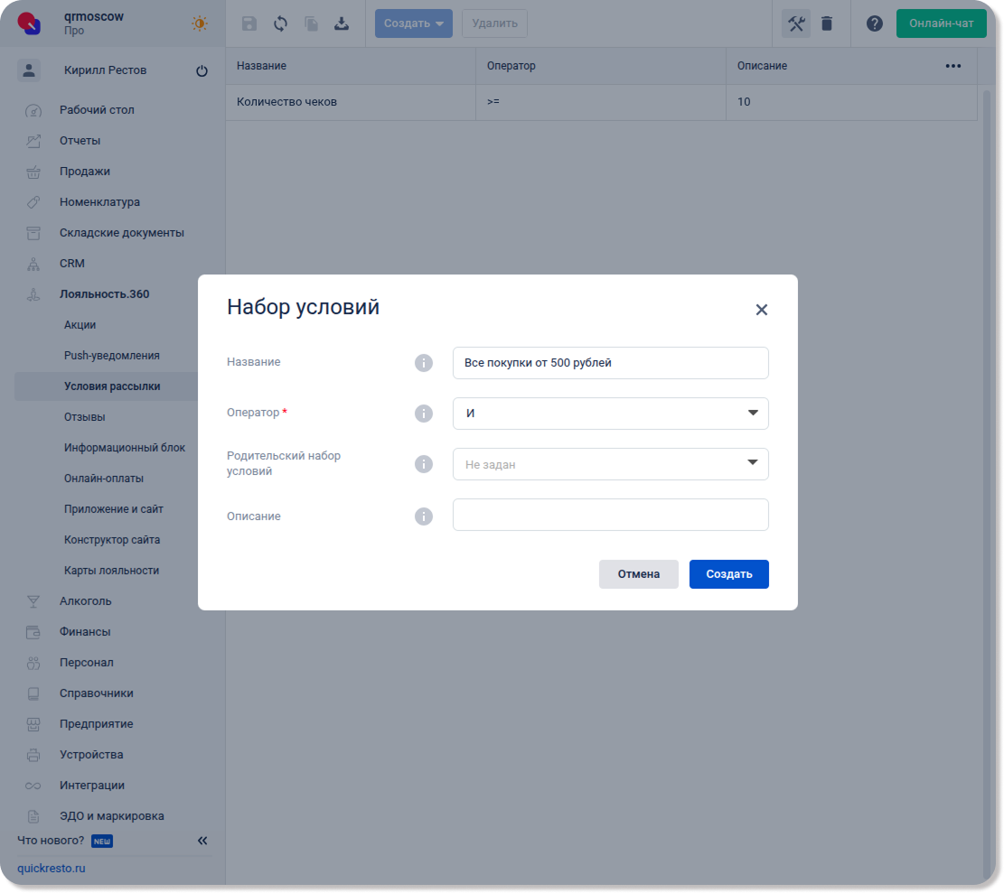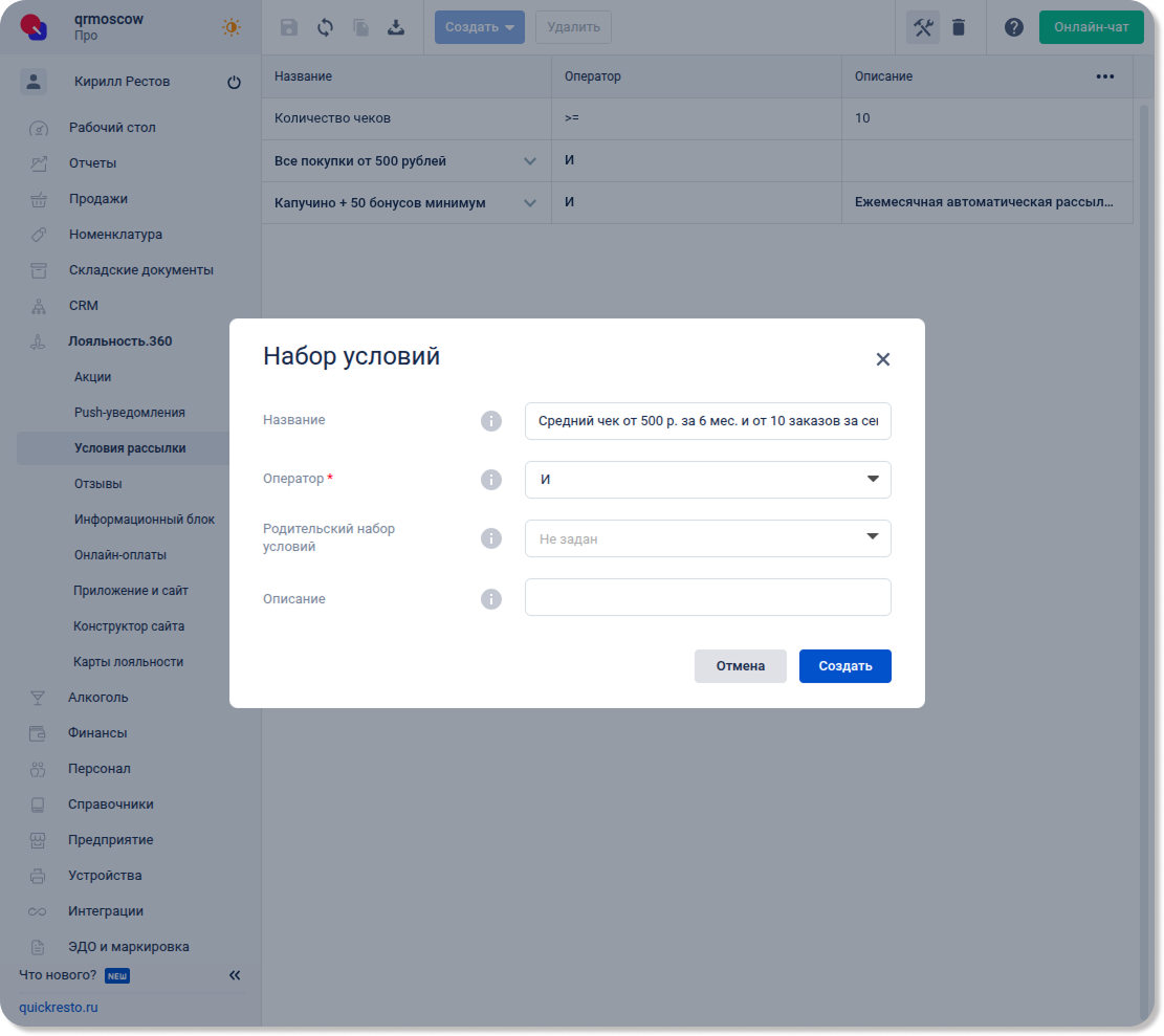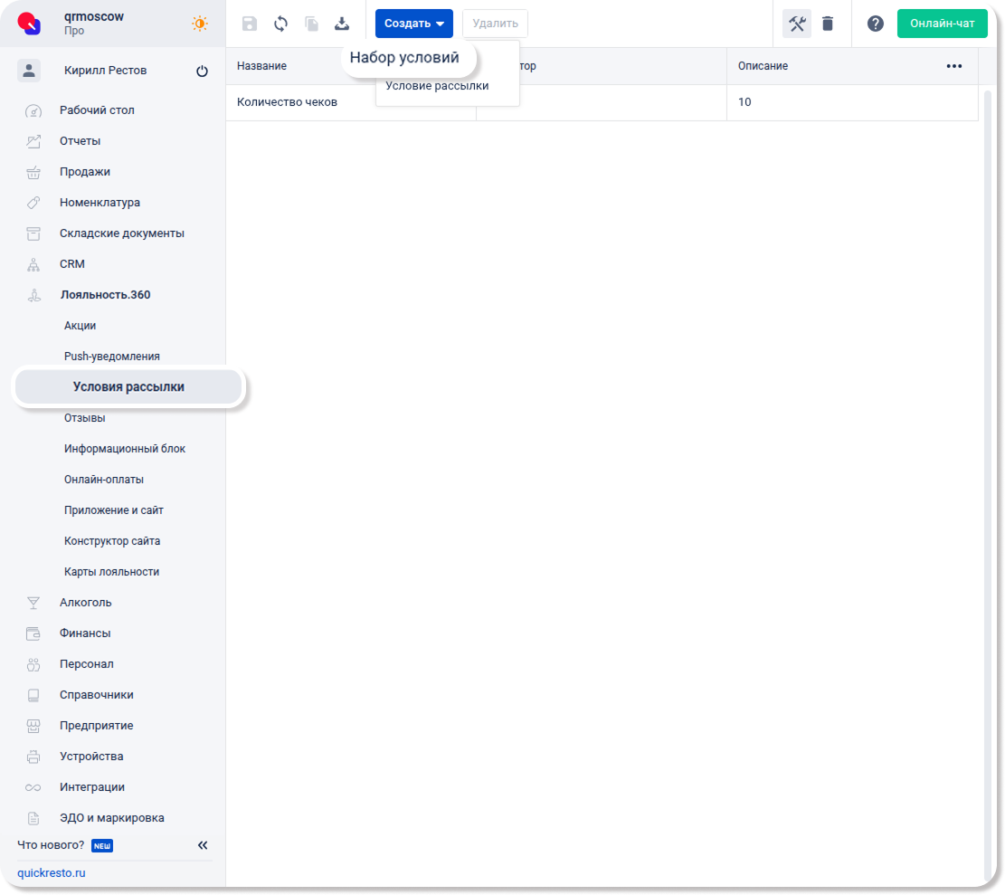 Перейдите в раздел Лояльность.360 — Условия рассылки, нажмите Создать и выберите Набор условий.