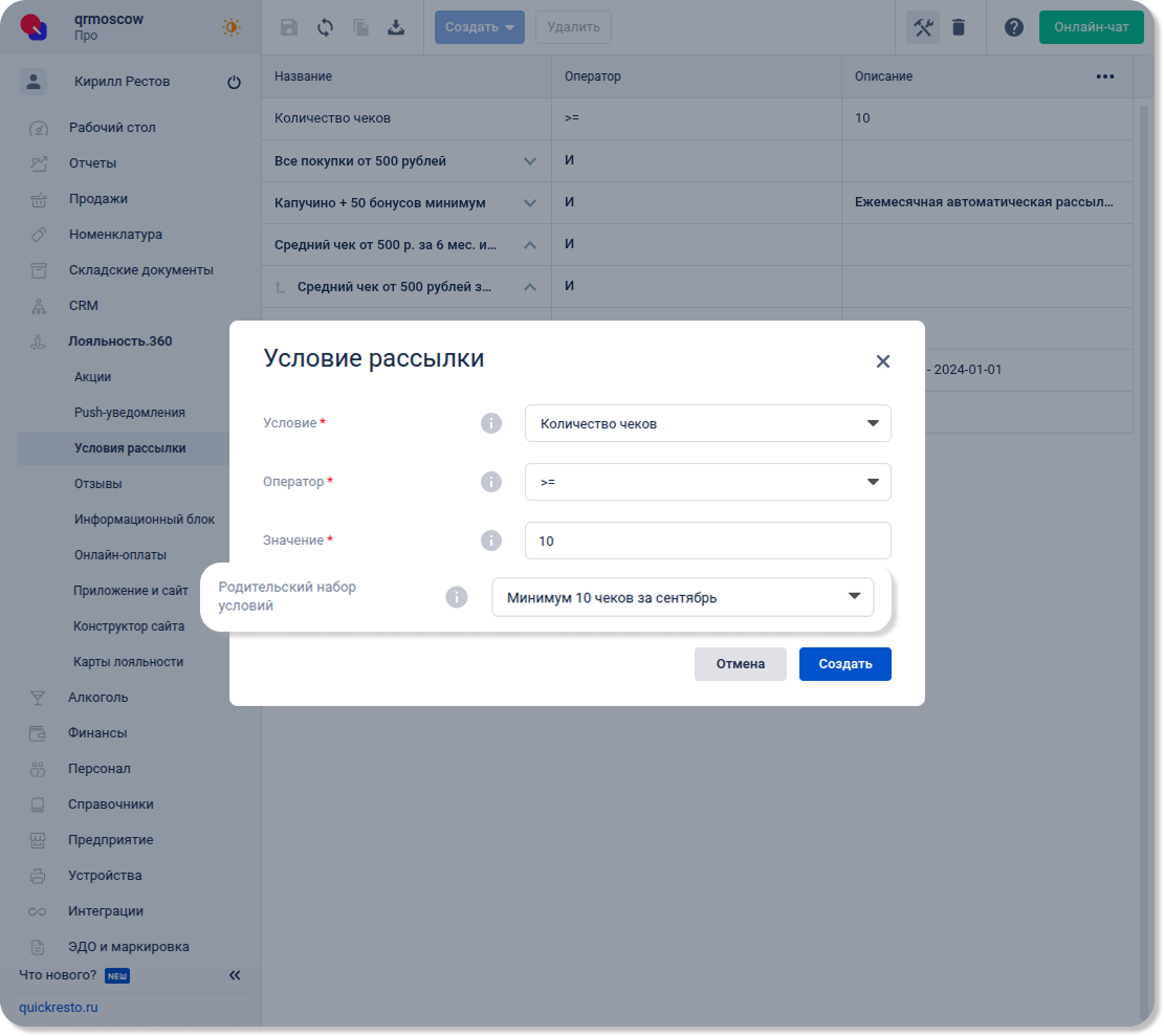 Перейдите в раздел Лояльность.360 — Условия рассылки, нажмите Создать и выберите Условие рассылки.
