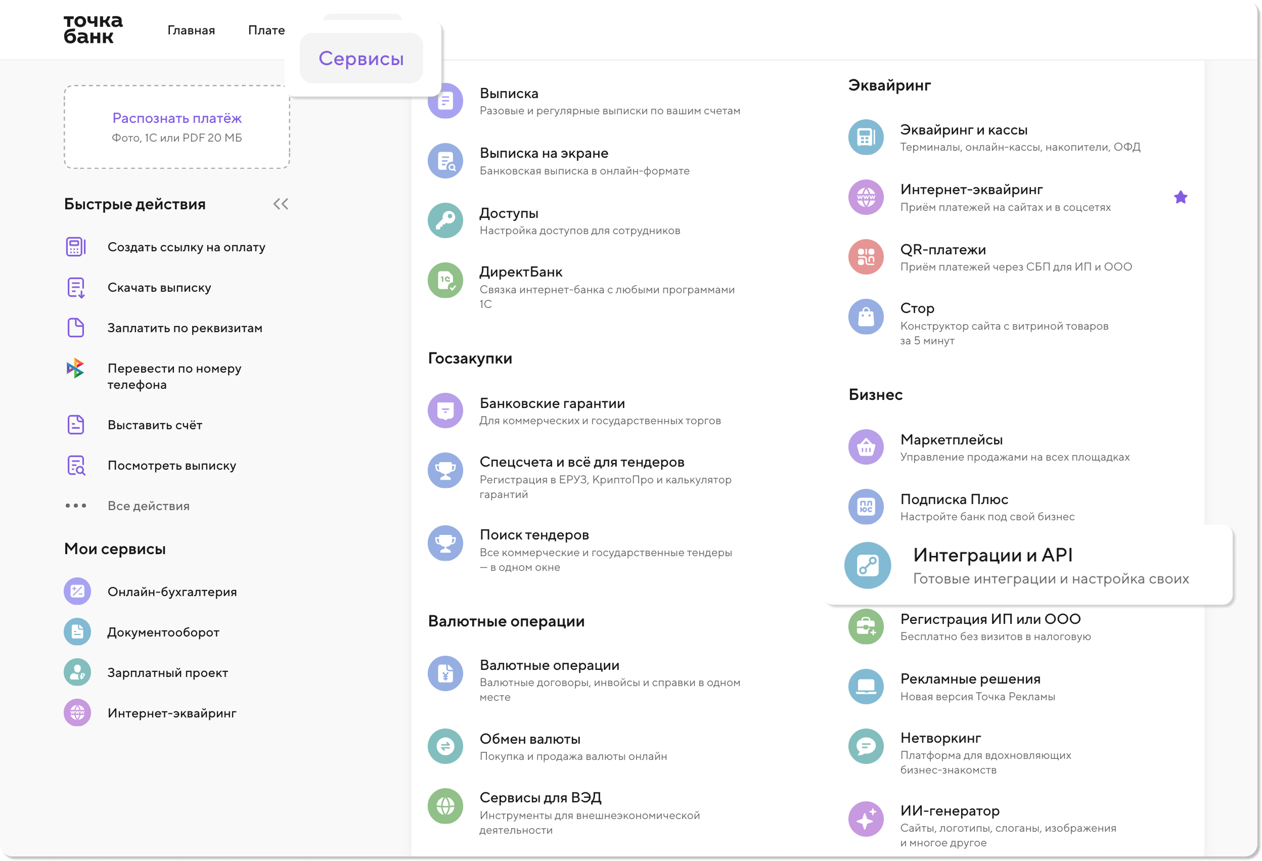 1) На главной странице личного кабинета банка перейдите в раздел Сервисы. В блоке Бизнес выберите Интеграции и API.