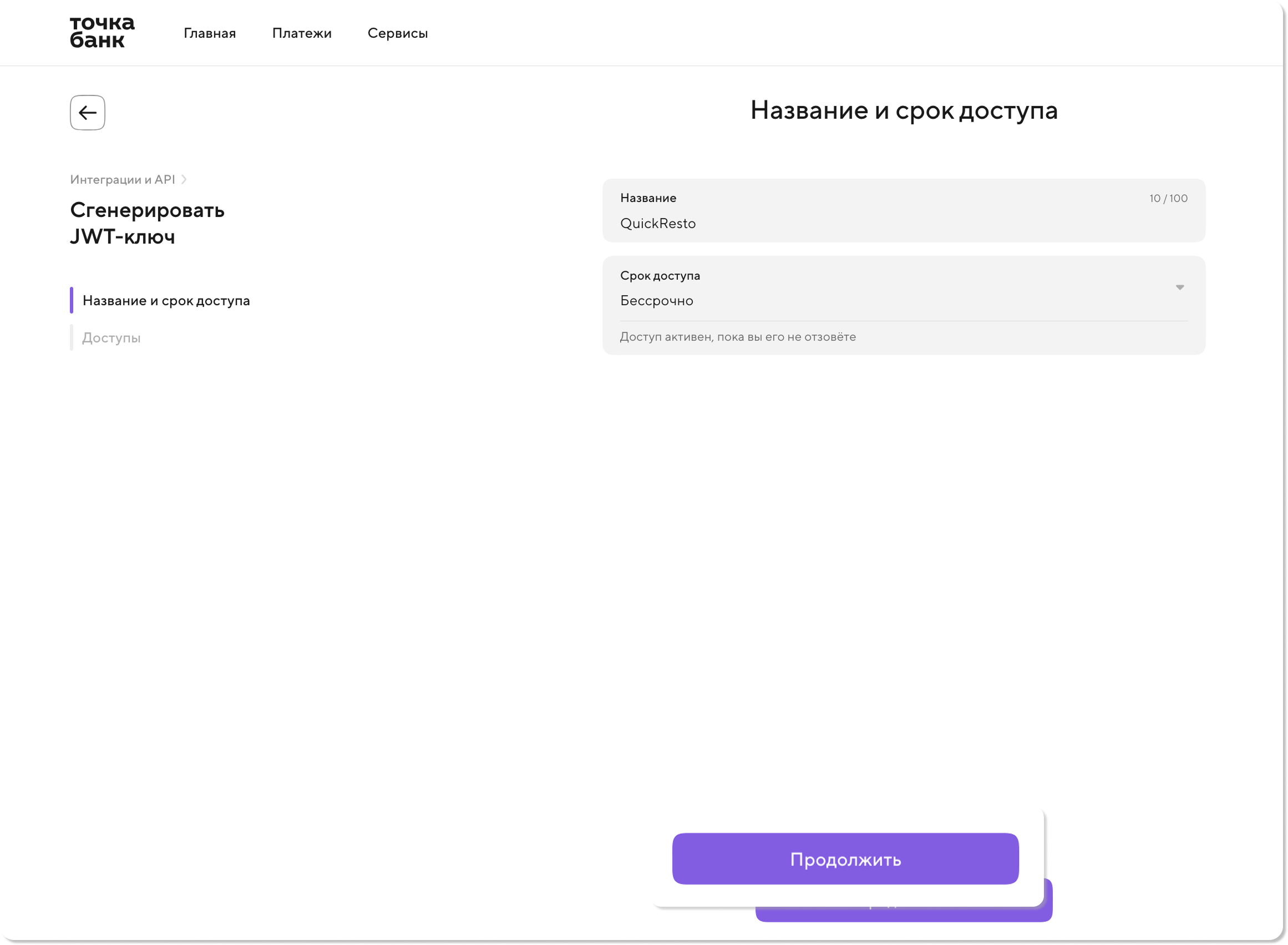 4) Введите название для вашего ключа и задайте срок его действия. Срок можно выбрать: бессрочно, полгода, год или указать вручную. После этого нажмите Продолжить.