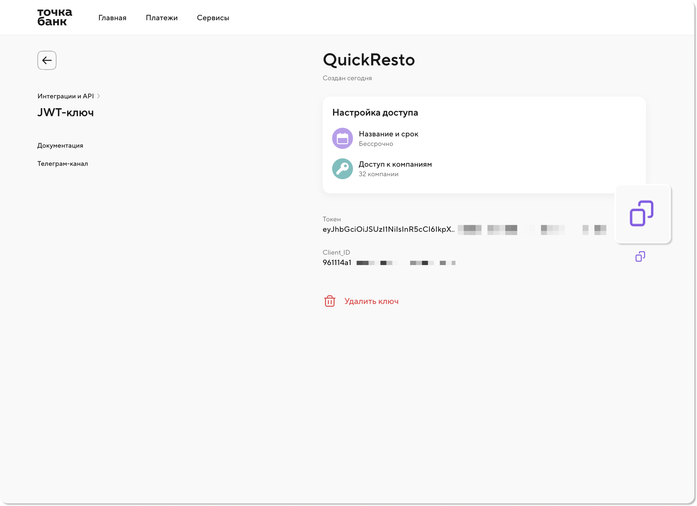 8) Откроется страница с параметрами вашего ключа, где также будет доступна возможность скопировать JWT-токен.