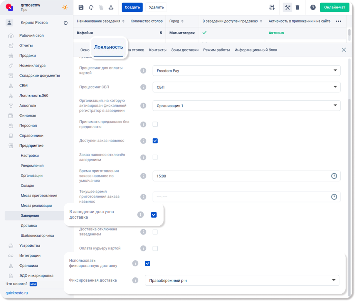 Затем перейдите в раздел Предприятие — Заведения и выберите заведение, для которого необходимо настроить фиксированную доставку.