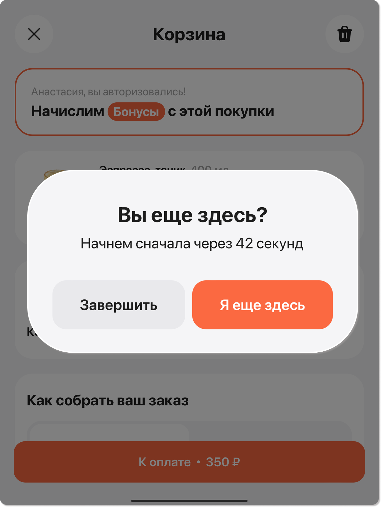Сессия автоматически завершится после успешной оплаты заказа. Кроме того, она будет деактивирована, если гость не совершает никаких действий на экране в течение определённого времени. В этом случае появится всплывающее окно с обратным отсчётом до окончания сессии.