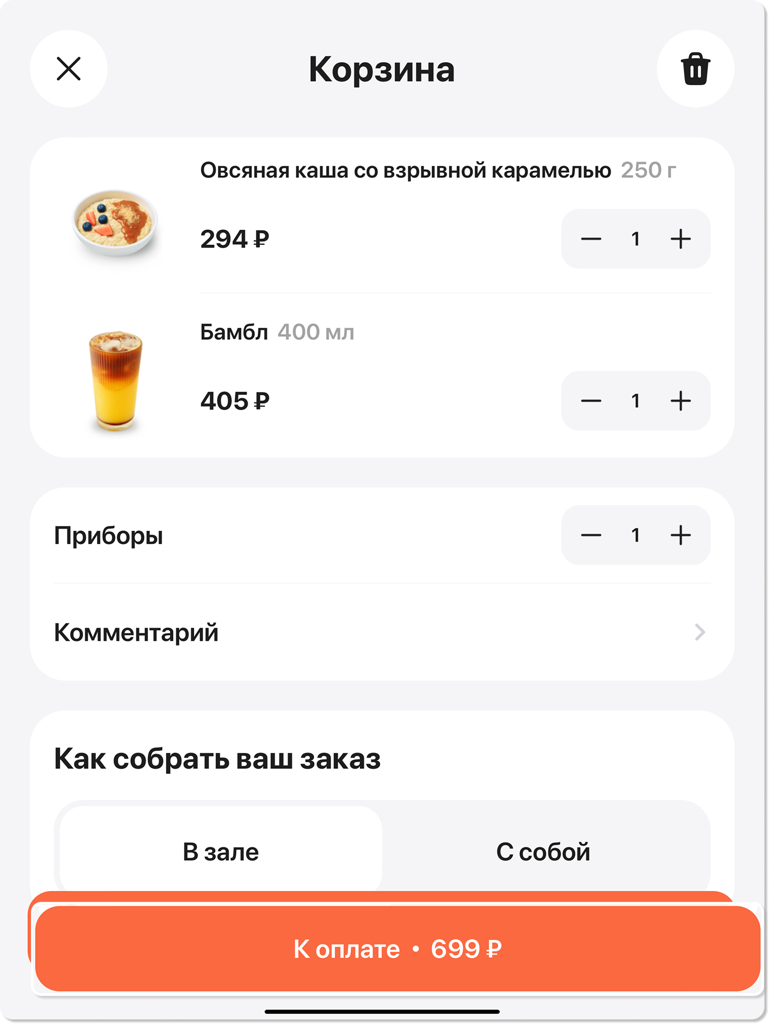 4. Откроется окно с позициями, суммой и дополнительными настройками заказа. Проверьте сформированный заказ, при необходимости добавьте дополнительные блюда, приборы, комментарий, а также укажите нужный тип заказа (Доставка или Самовывоз).