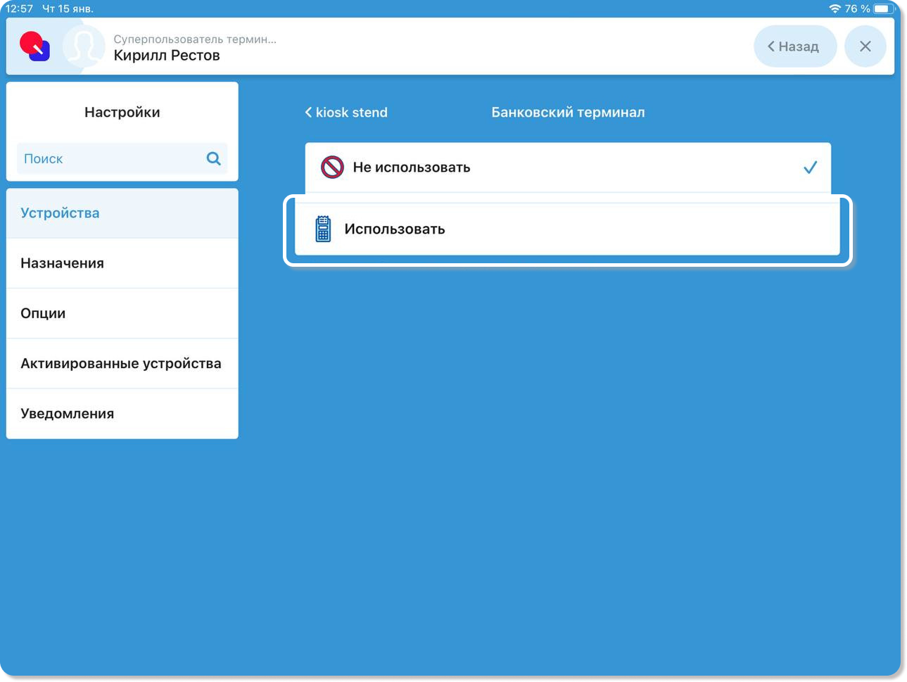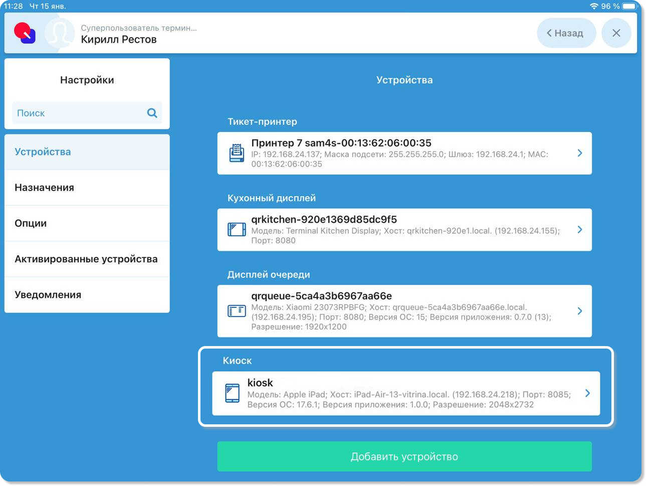 3. На вкладке Устройства найдите пункт Киоск. Нажмите на нужное устройство, чтобы открыть его настройки.