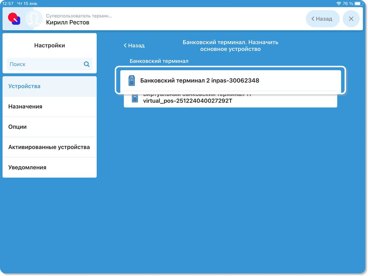 5. Нажмите на поле Выбор устройств, чтобы выбрать банковский терминал.