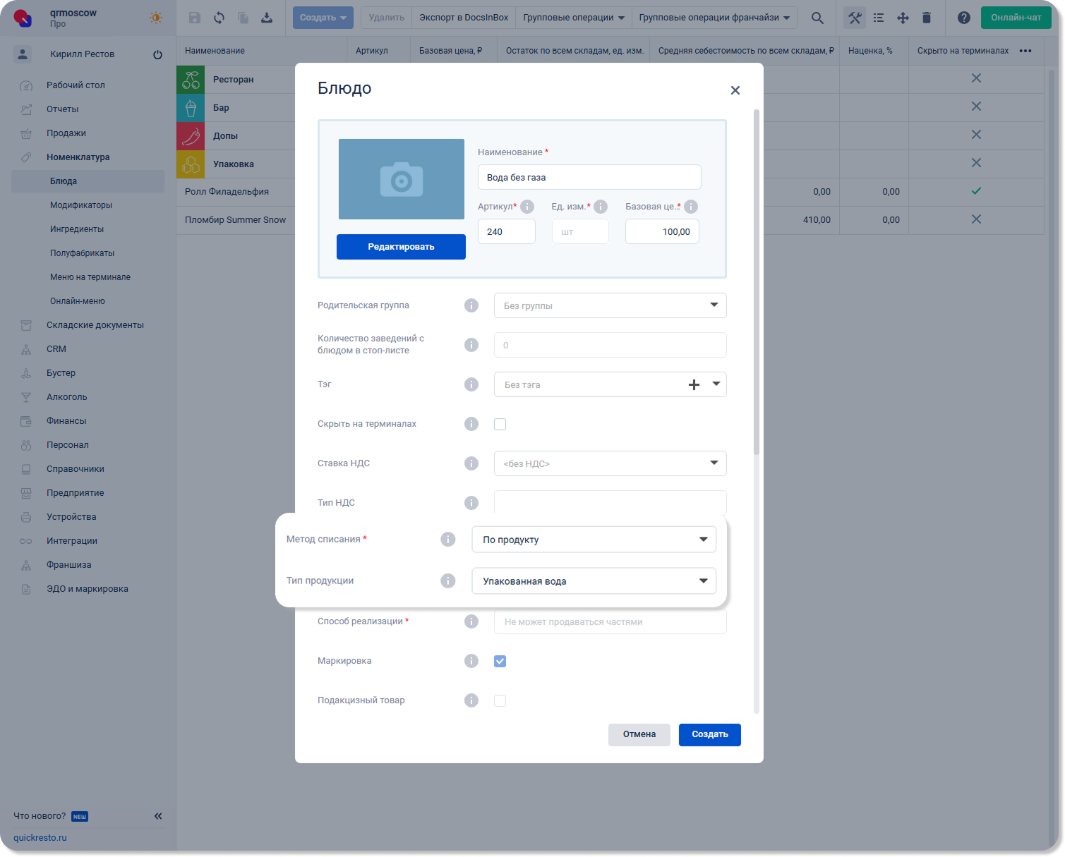 При продаже упакованной воды нужно завести блюдо с методом списания По продукту и с типом продукции Упакованная вода. Данный выбор значения будет влиять на автоматическое изменение таких полей, как: