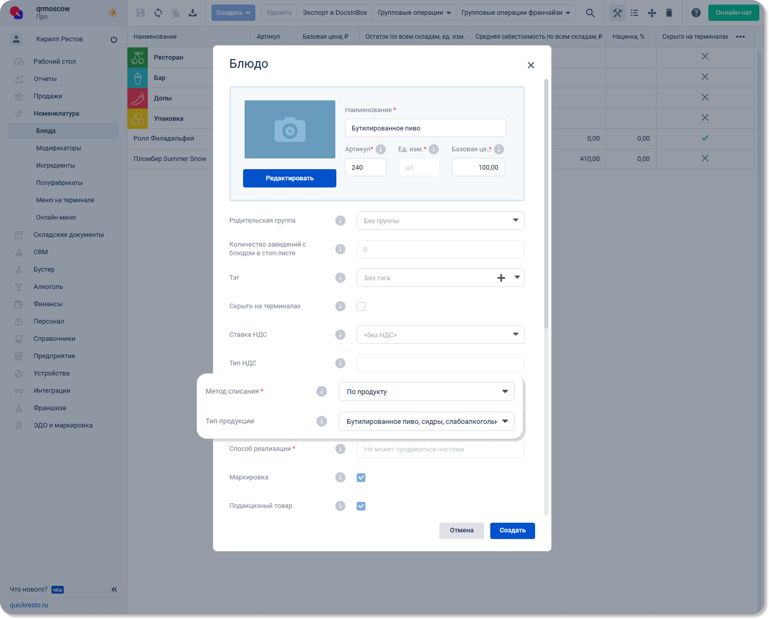 При продаже пива или слабоалкогольных напитков нужно завести блюдо с методом списания По продукту и с типом продукции Бутилированное пиво, сидры и слабоалкогольные напитки. Данный выбор значения будет влиять на автоматическое изменение таких полей, как: