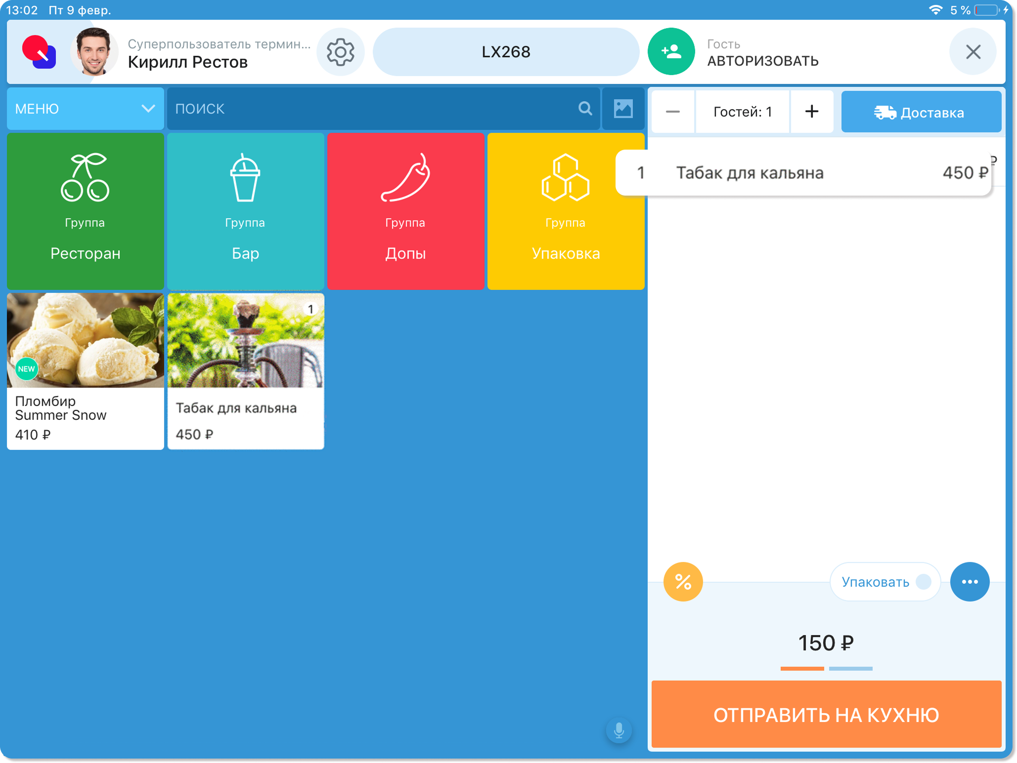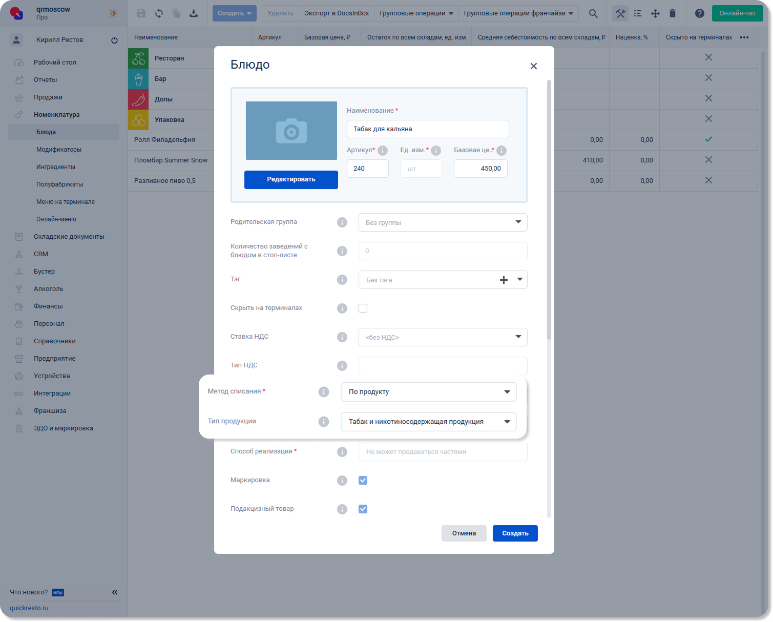 Табак: При продаже табака (включая табак для кальяна в фабричной упаковке, пачки сигарет) нужно завести блюдо с методом списания По продукту и с типом продукции Табак и никотиносодержащая продукция. Данный выбор значения будет влиять на автоматическое изменение таких полей, как: