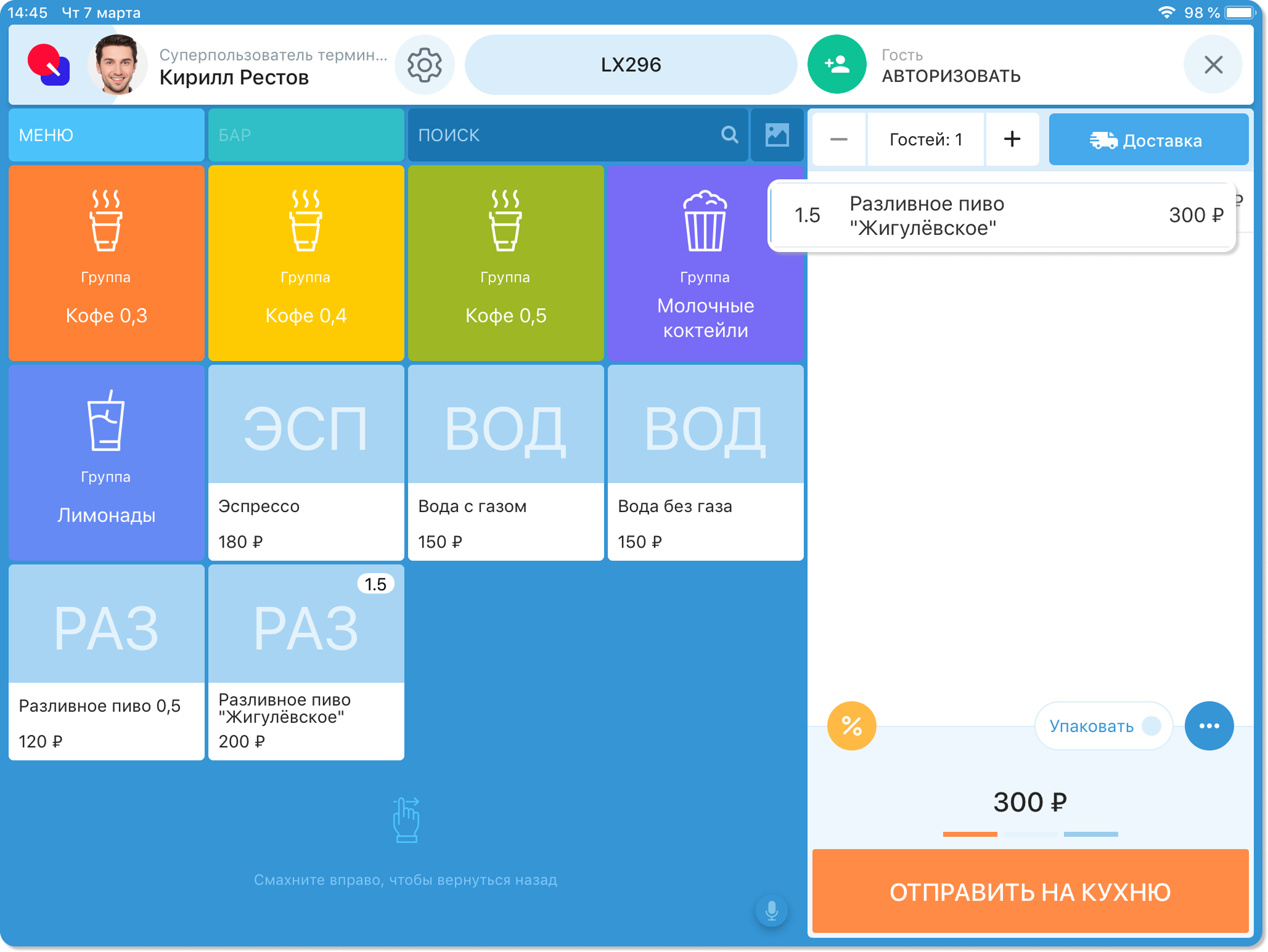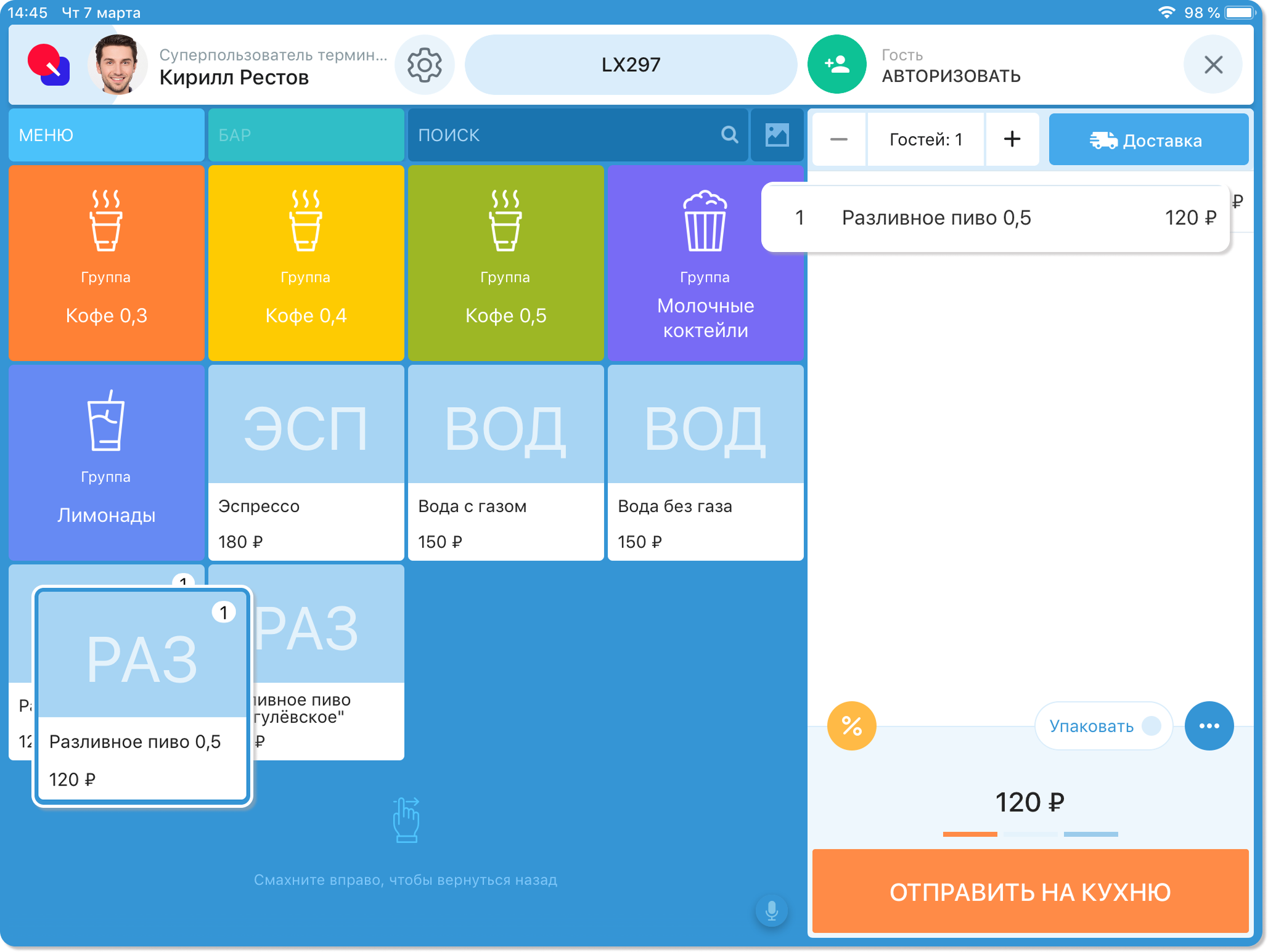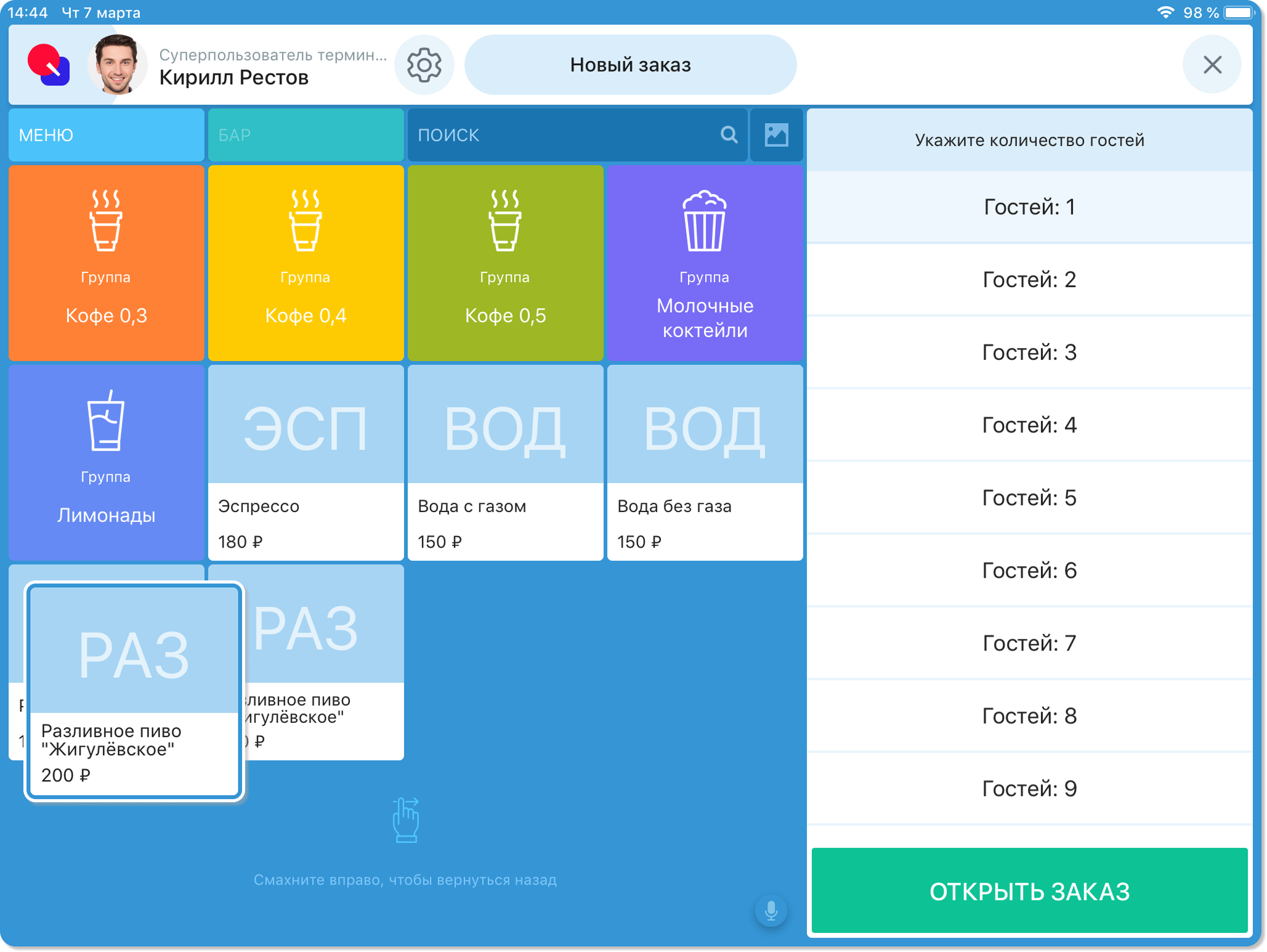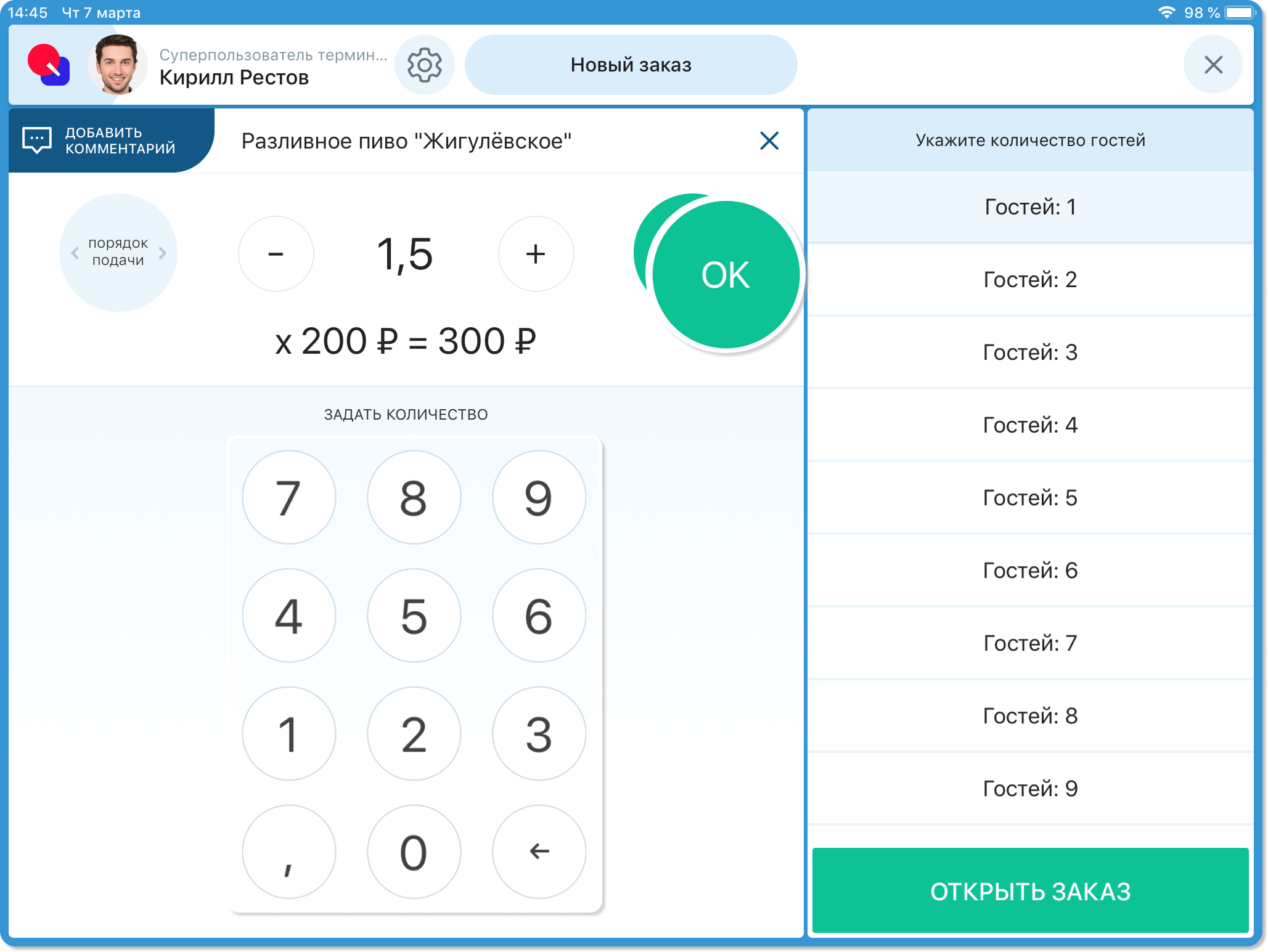 Для продажи разливного пива (сидра) на кассовом терминале со способом реализации «Требовать ввод веса при продаже», откройте заказ и выполните действия: