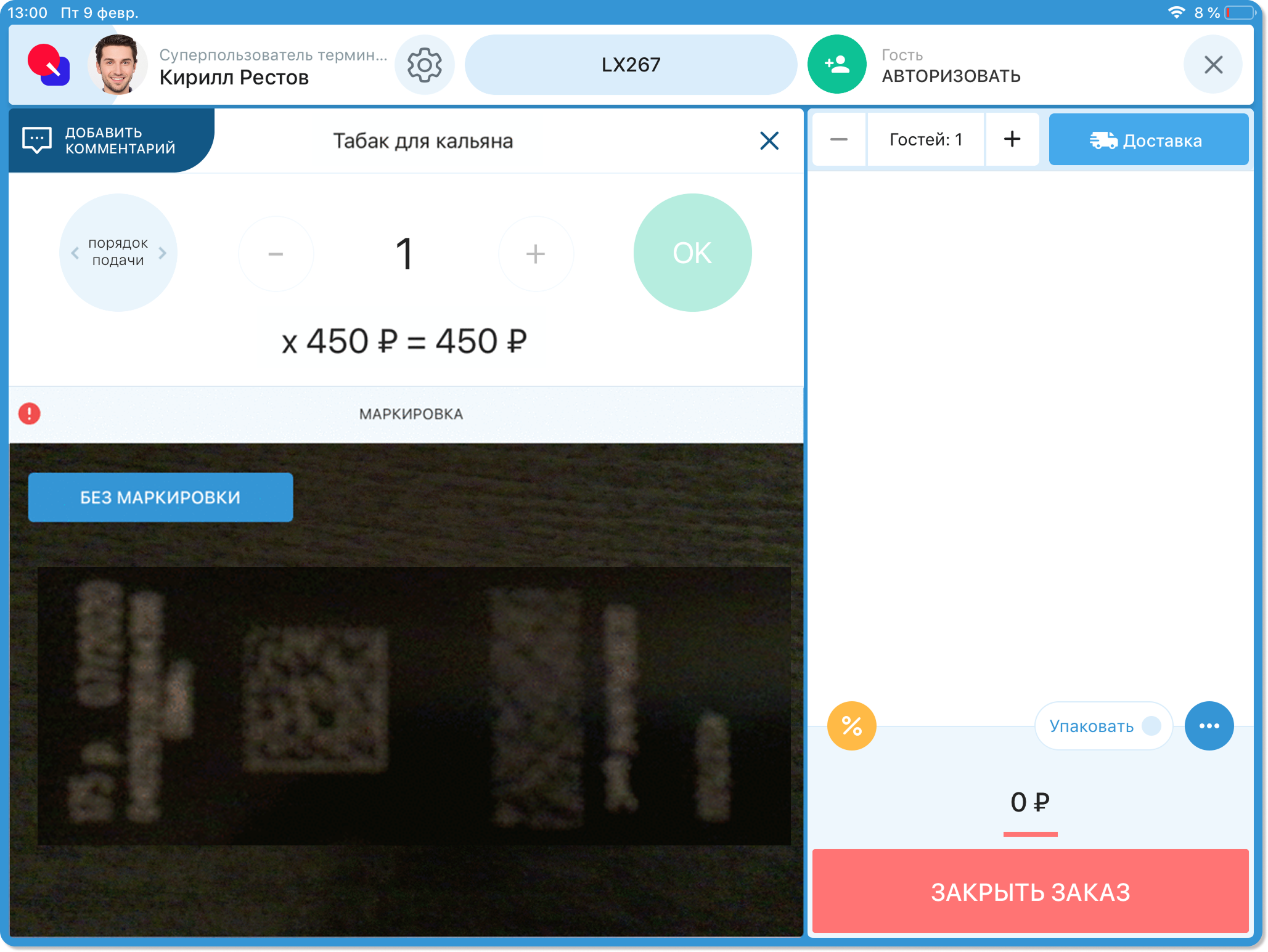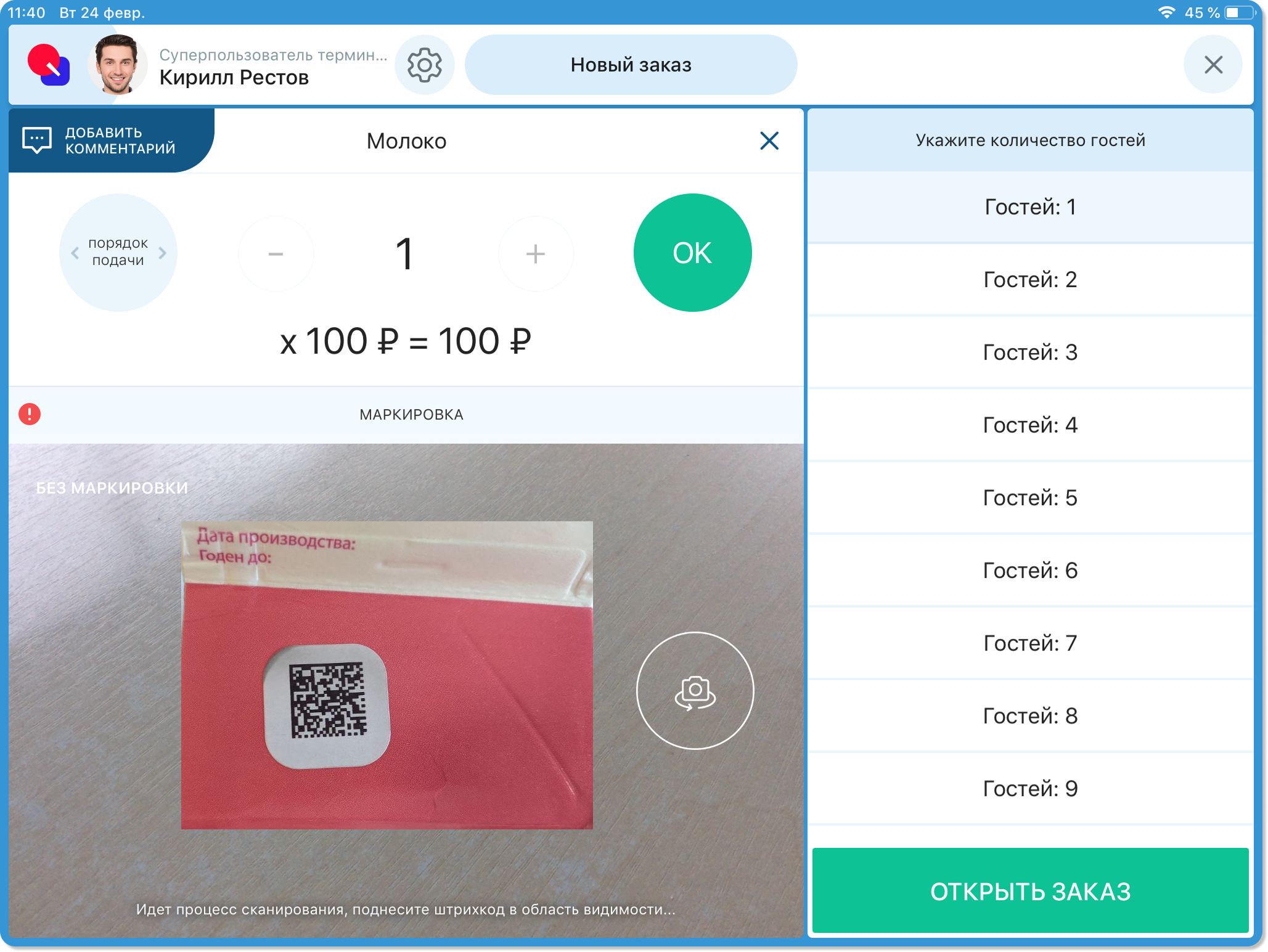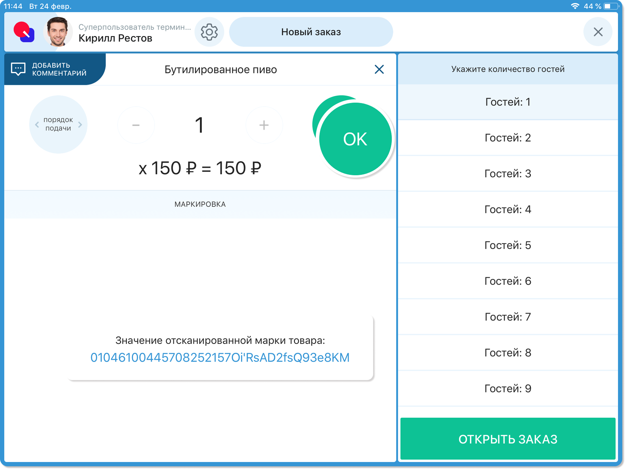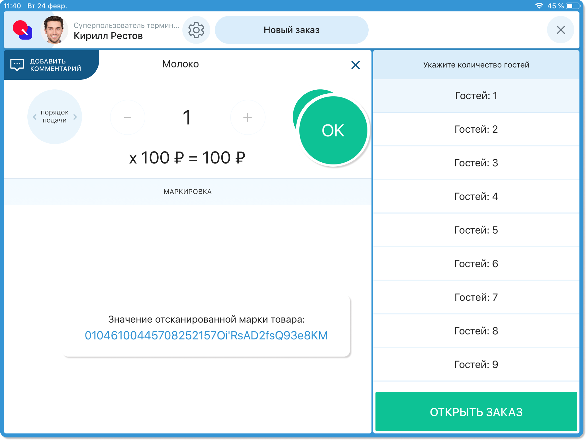 Для продажи маркированного продукта откройте на кассовом терминале заказ и выполните действия: