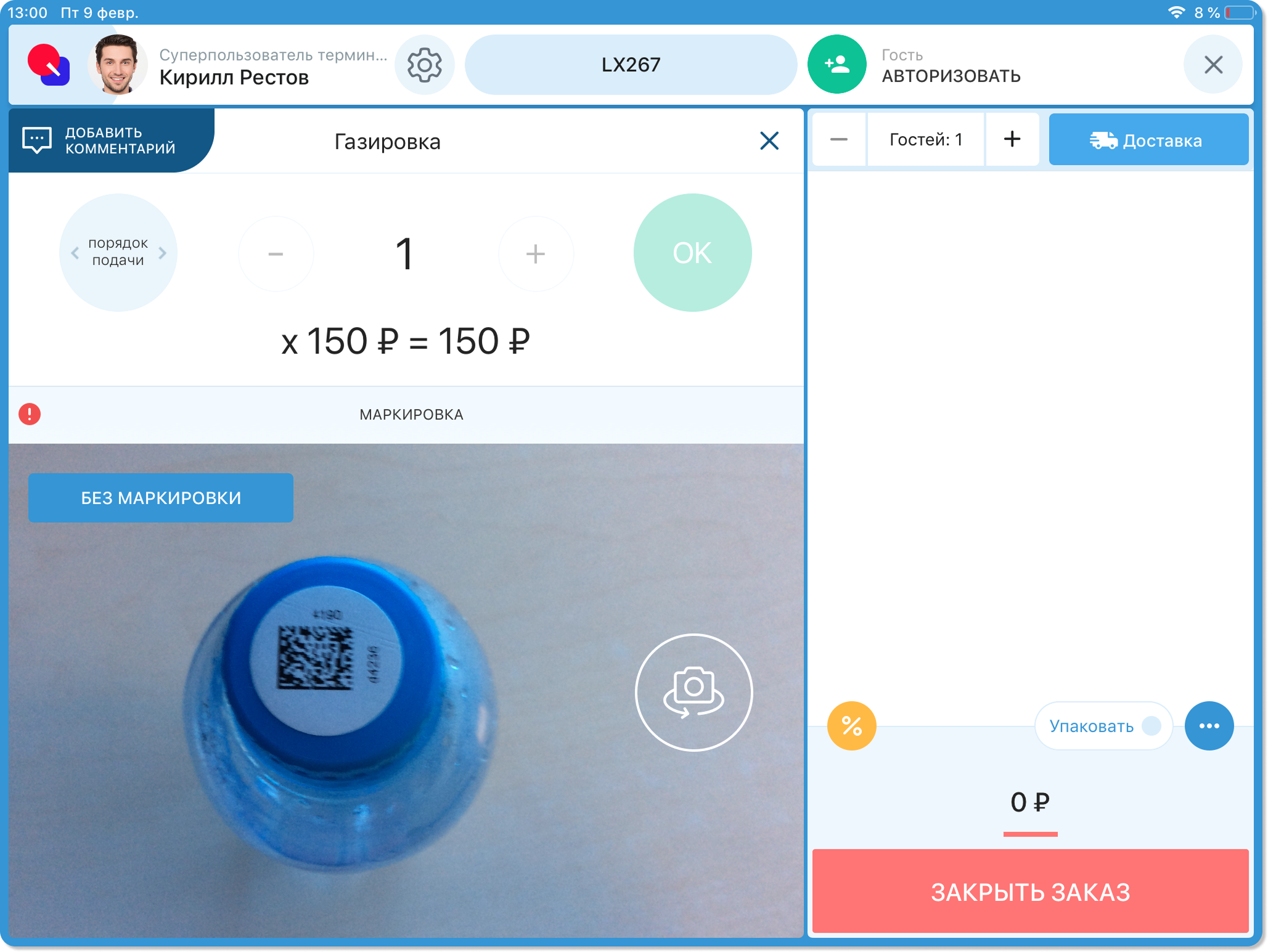При реализации разливного пива марку сканировать не нужно, необходимо указать количество приобретаемого продукта. Марку не сканируем, так как при продаже передается значение GTIN, указанное в бэк-офисе при настройке блюда.