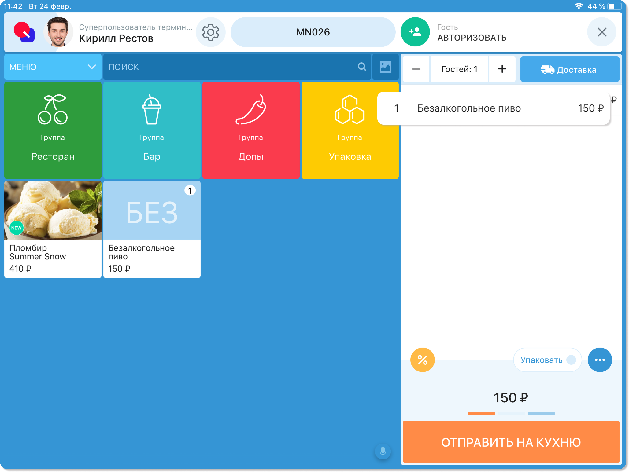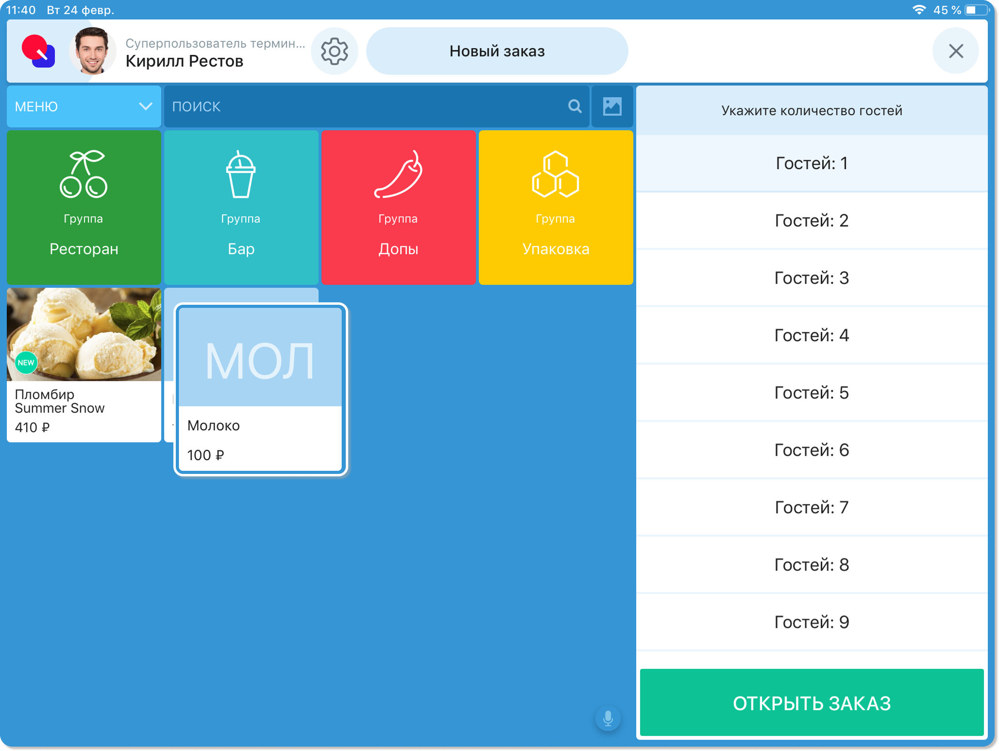 Для продажи сахаросодержащих напитков откройте на кассовом терминале заказ и выполните действия: