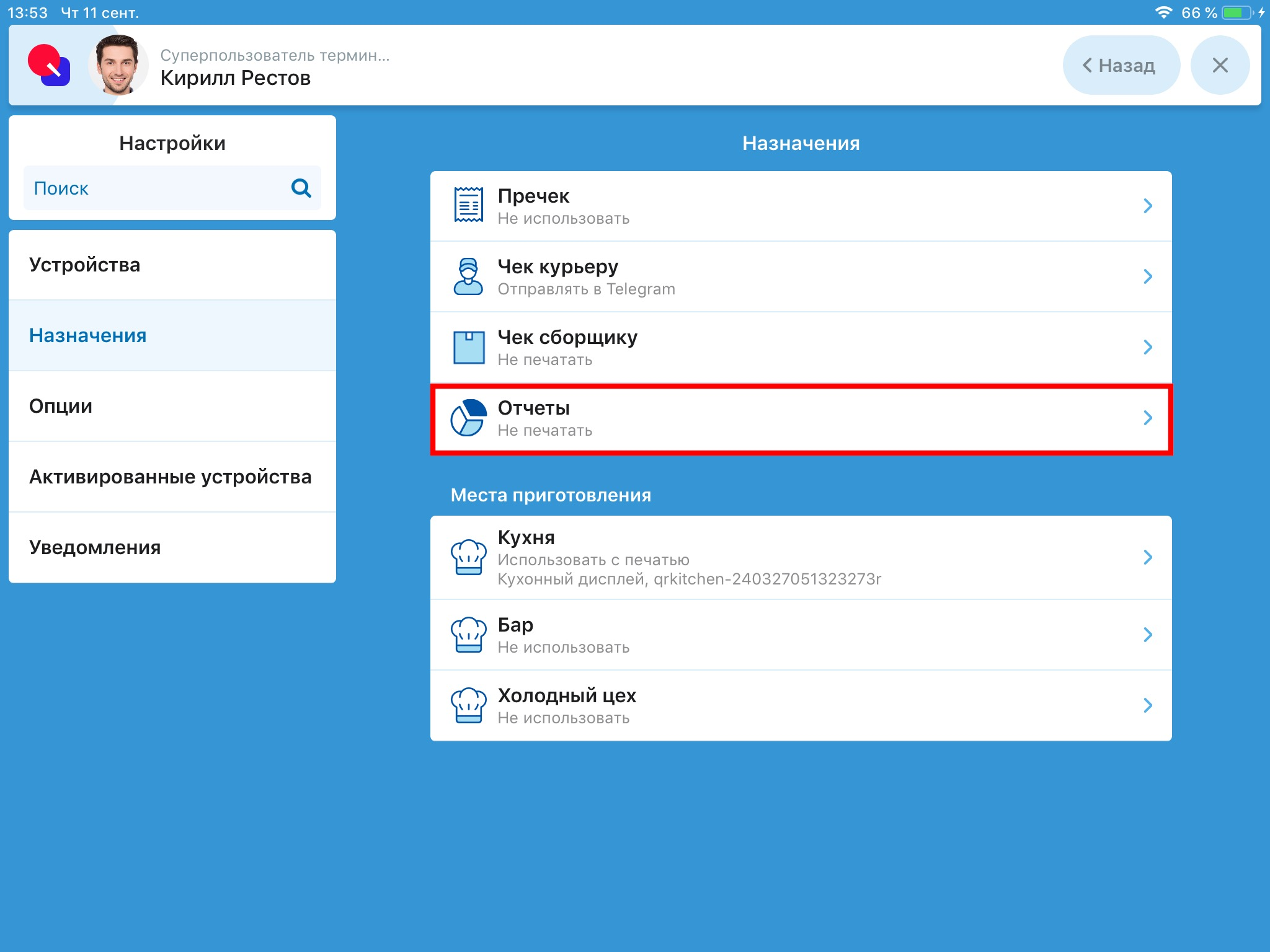 Чтобы настроить печать пречеков, отчетов или кухонных чеков, выполните действия: