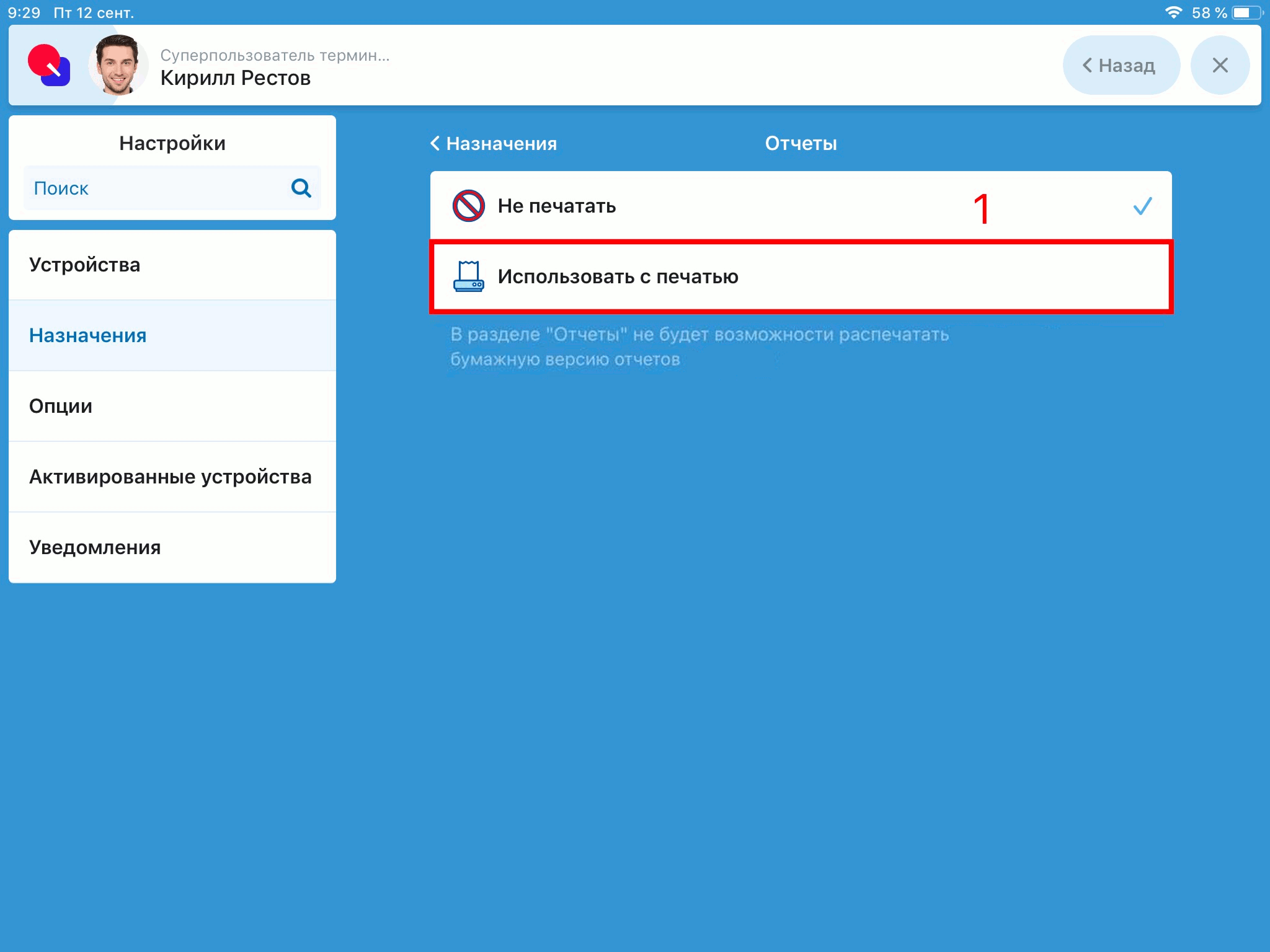 • Использовать с печатью — В разделе Отчеты появится возможность распечатать бумажную версию отчетов.