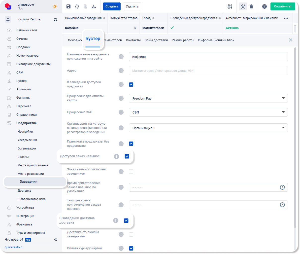2. Включить необходимые поля в бэк-офисе. В разделе Предприятие — Заведения на вкладке Бустер, а именно Доступен заказ навынос и/или В заведении доступна доставка.