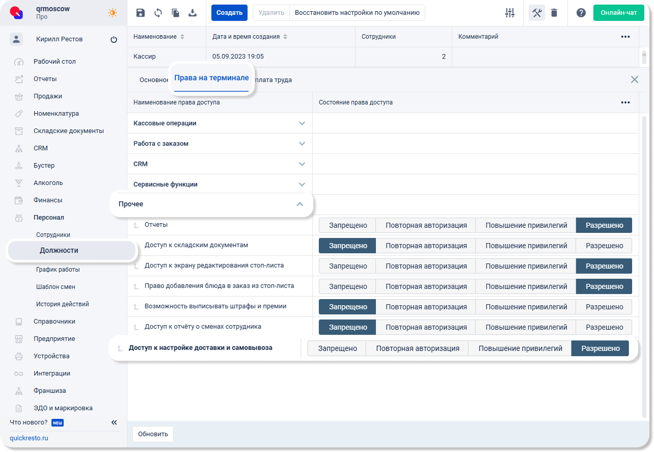 3. Настроить доступ для должностей. Для этого перейдите в бэк-офисе в раздел Персонал — Должности и выполните действия: