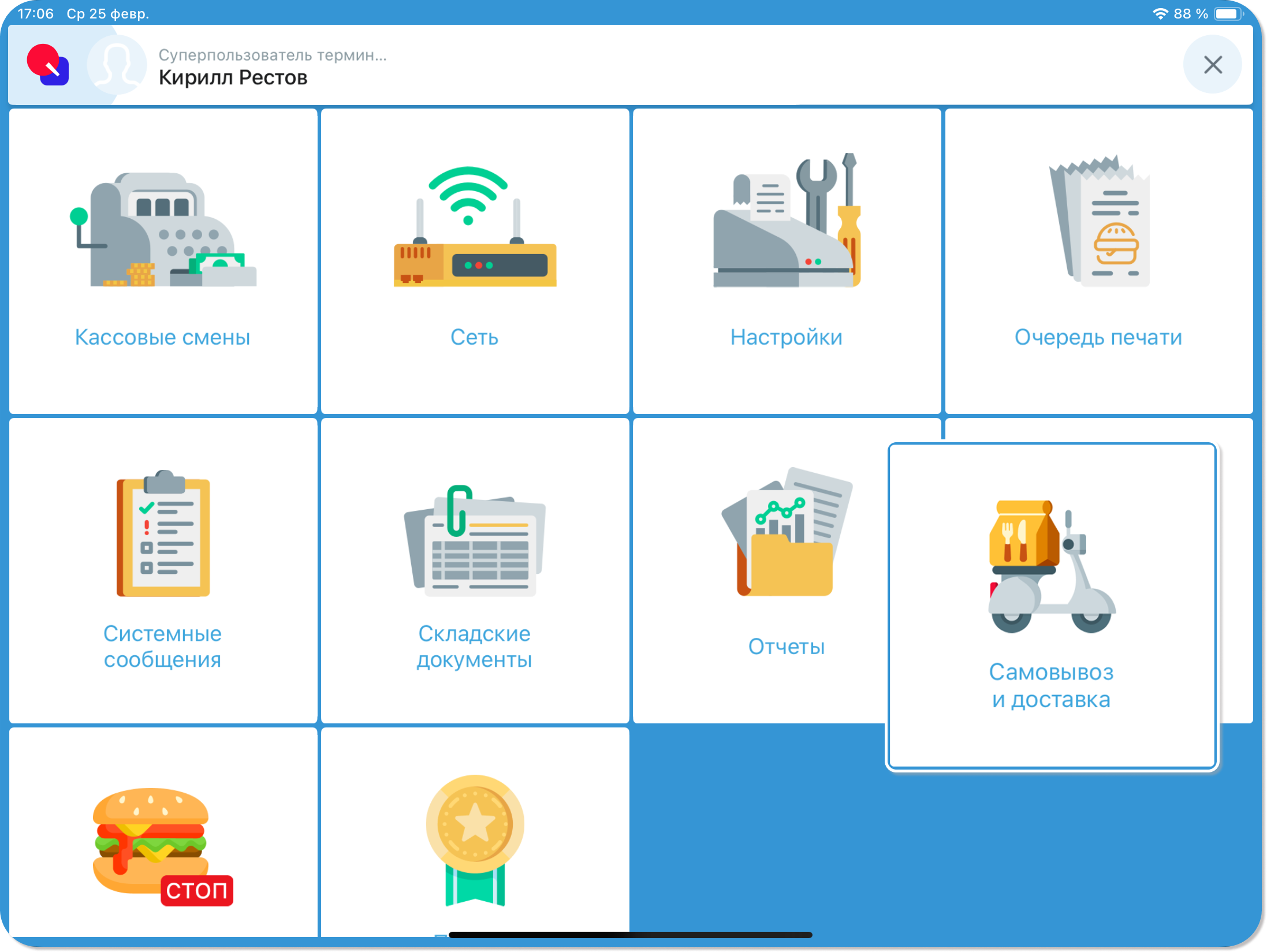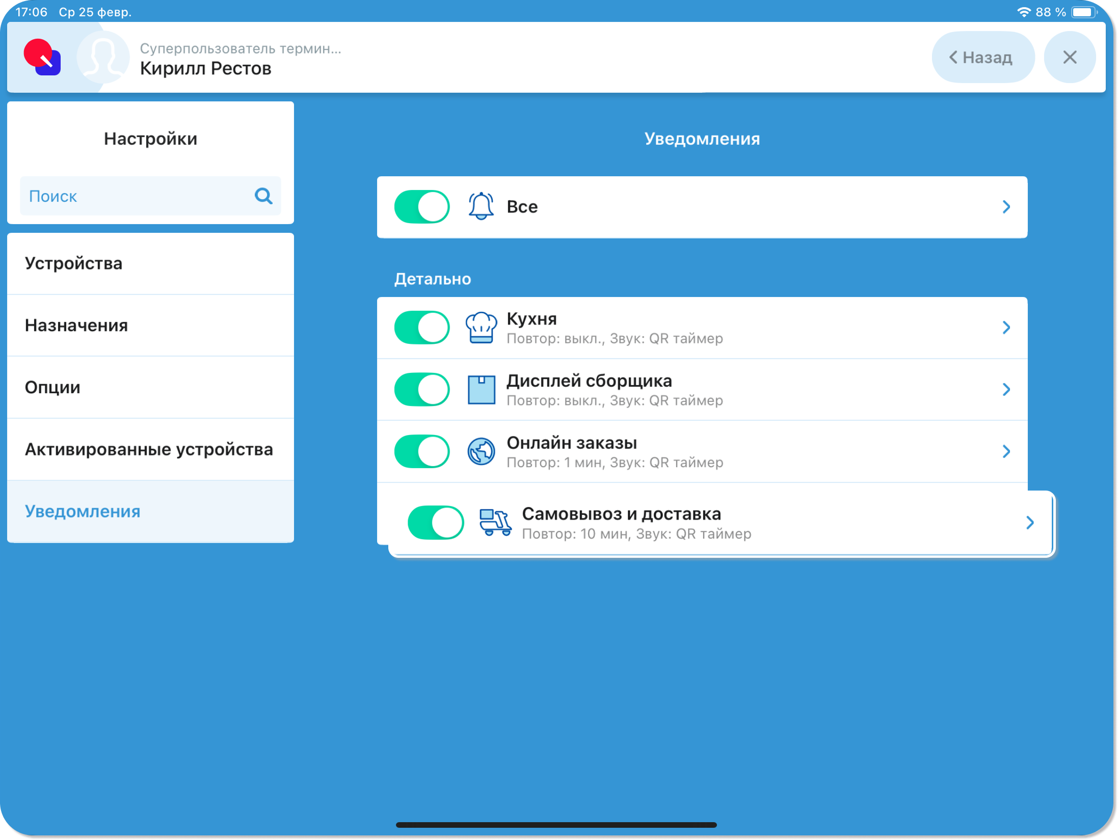 Раздел Самовывоз и доставка позволяет гибко настраивать параметры времени и доступности для получения заказов клиентами (самовывоз или доставка) прямо через кассовый терминал. Это решение помогает значительно снизить рабочую нагрузку на ваше заведение и повысить лояльность гостей, поскольку они будут заранее проинформированы об ожидаемом времени получения заказа.