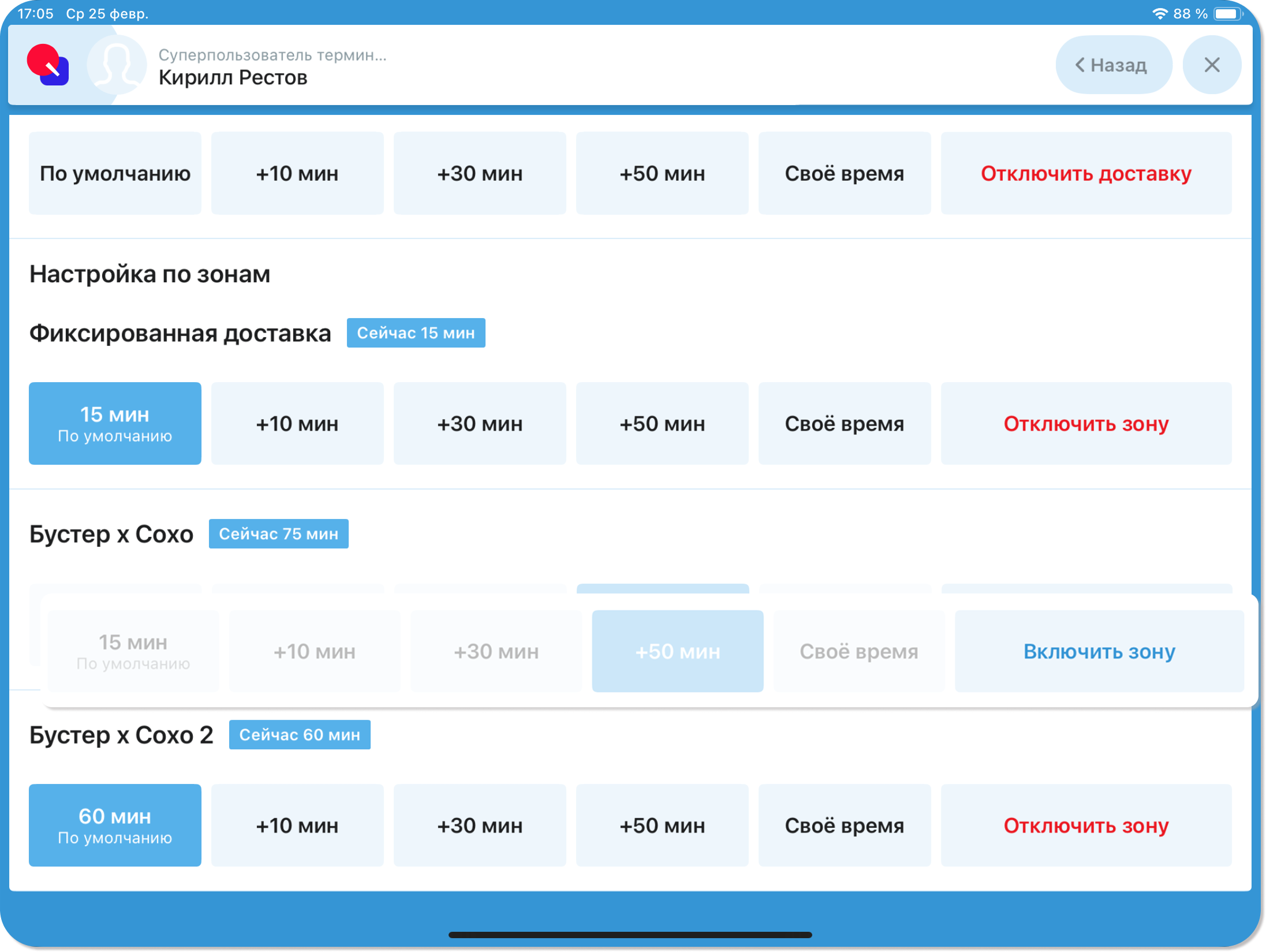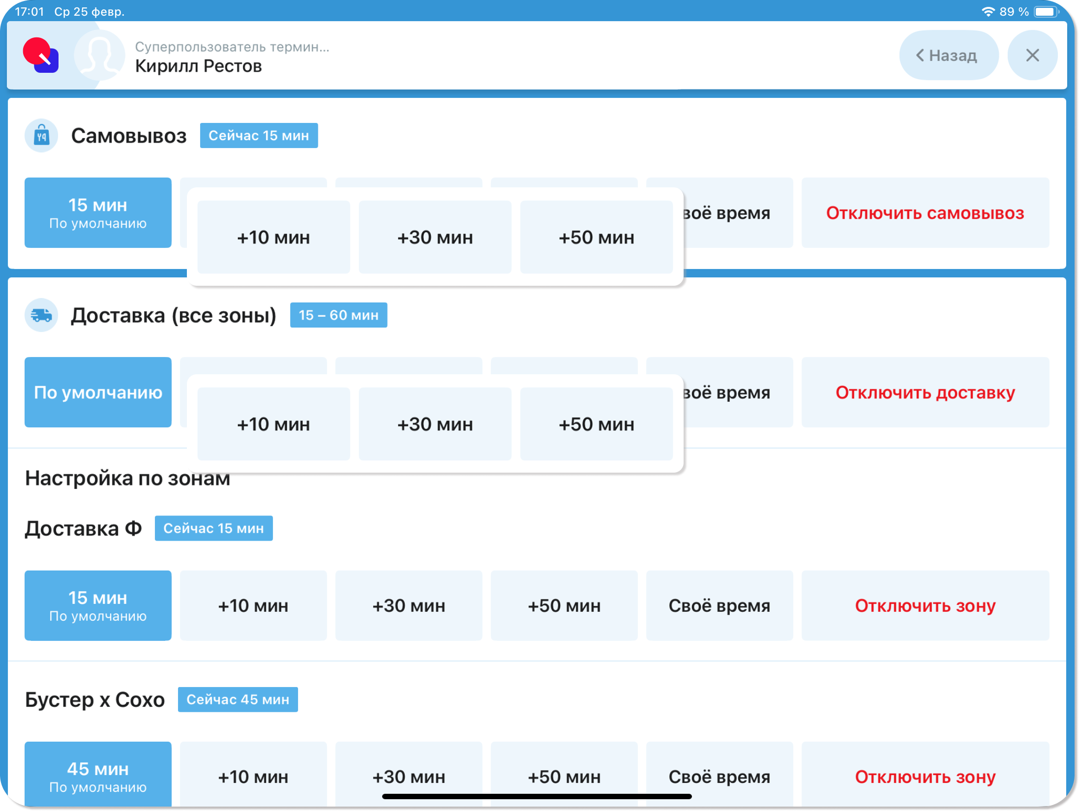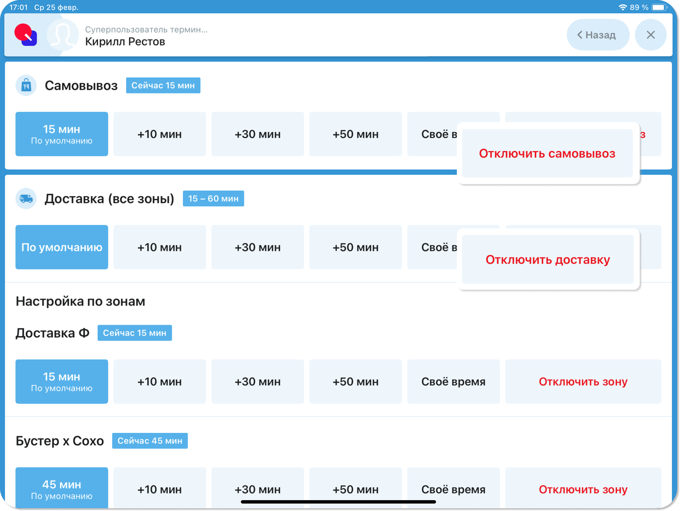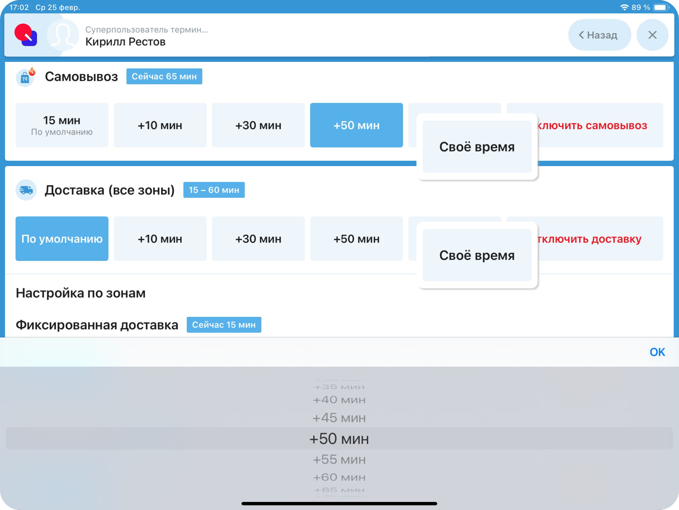 Управление временем и доступностью доставки и самовывоза на кассовом терминале