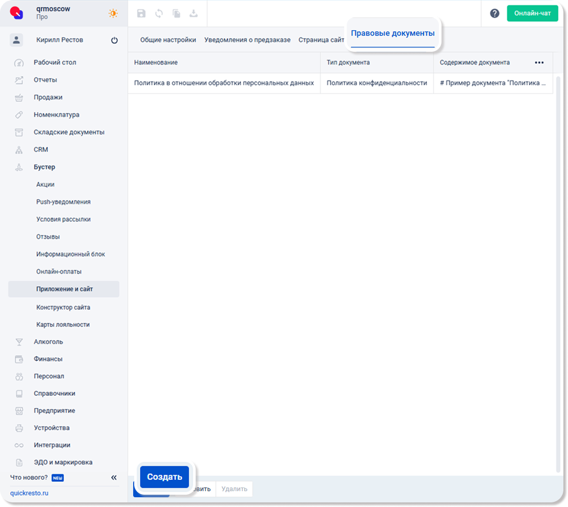 Для настройки Политики конфиденциальности и прочих документов перейдите на вкладку Правовые документы.