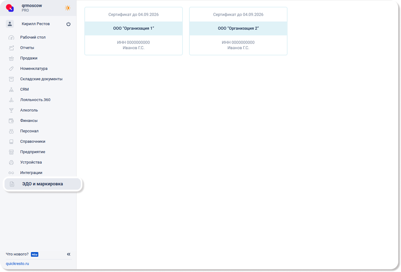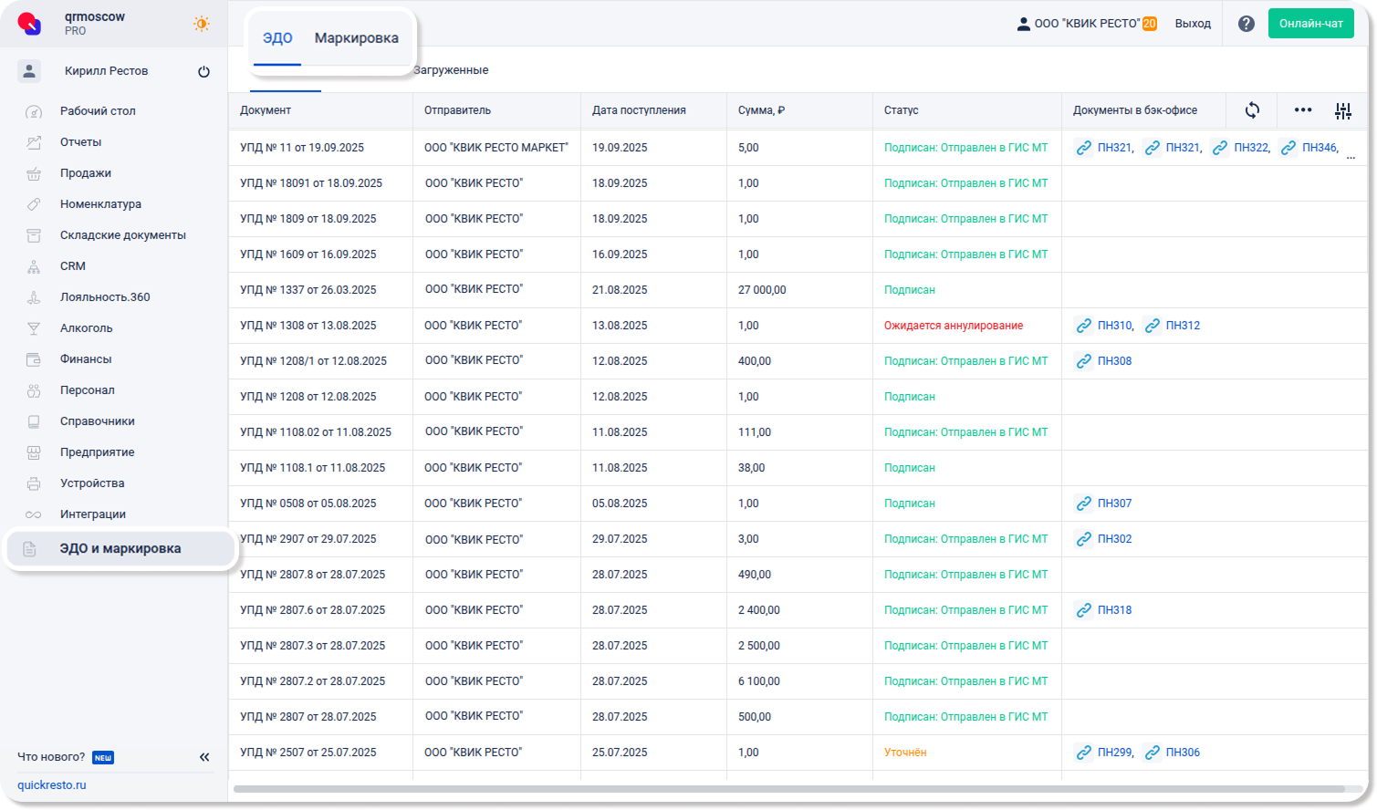 Раздел ЭДО предоставляет возможность работать с документами из системы документооборота «ЭДО Лайт». Здесь вы сможете просматривать и сверять коды маркировки, содержащиеся в документах, подписывать входящие документы, загружать файлы универсальных передаточных документов (УПД) из сервисов других операторов ЭДО и создавать приходные накладные в бэк-офисе на основе входящих и загруженных документов. Этот раздел состоит из трех вкладок: