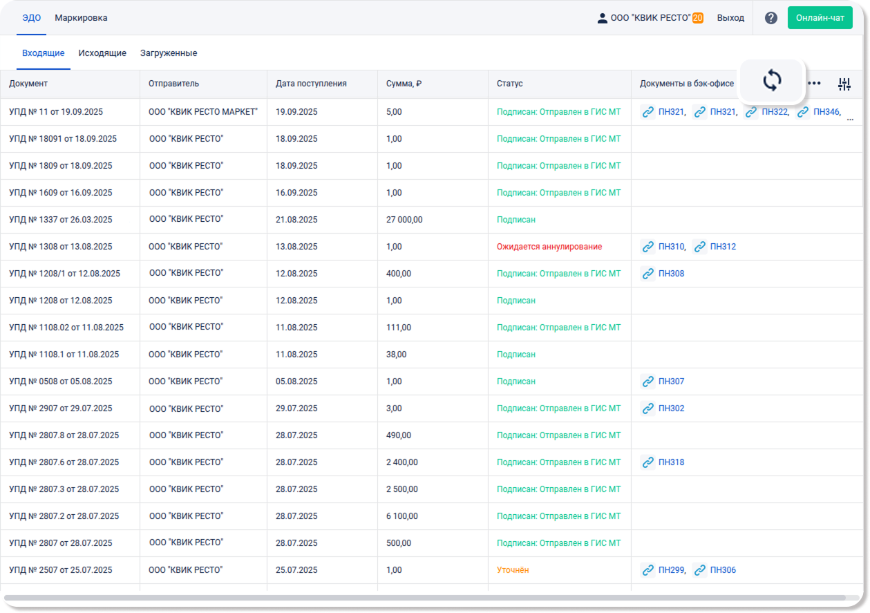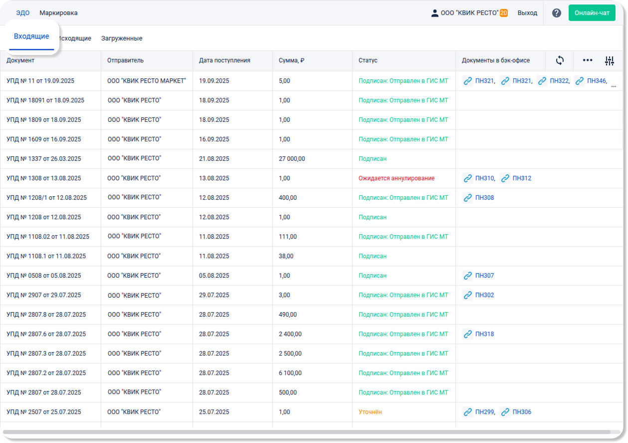 Эта вкладка будет полезна тем, кто хочет загружать УПД из сервисов сторонних операторов ЭДО и экспортировать их в виде приходной накладной в бэк-офис. Она исключает необходимость ручного создания учетных документов и значительно упрощает рабочий процесс.