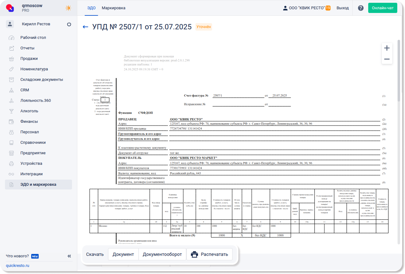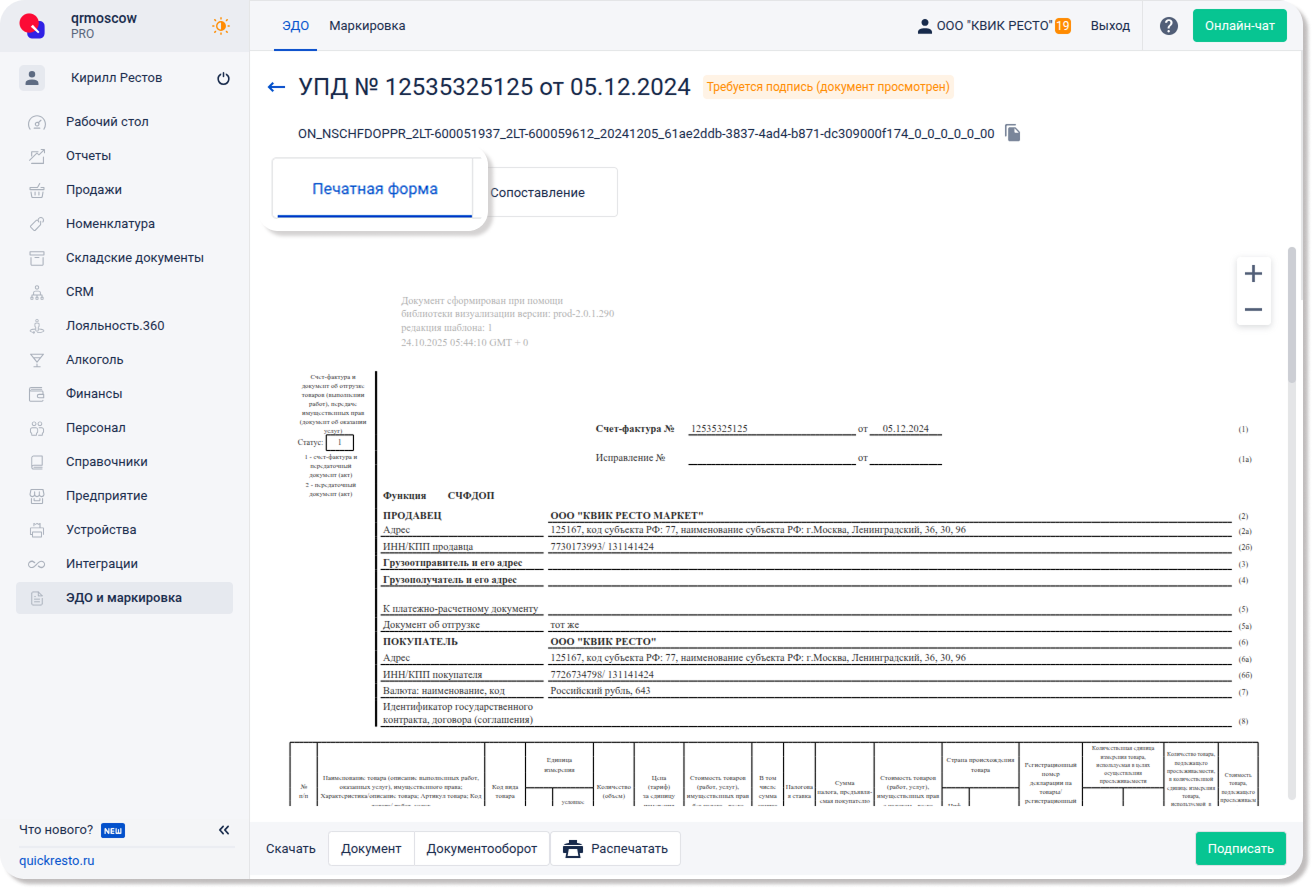На открывшийся странице вы можете просмотреть печатную форму документа и отправить её на печать, скачать исходный файл документа или архив со всем документооборотом.