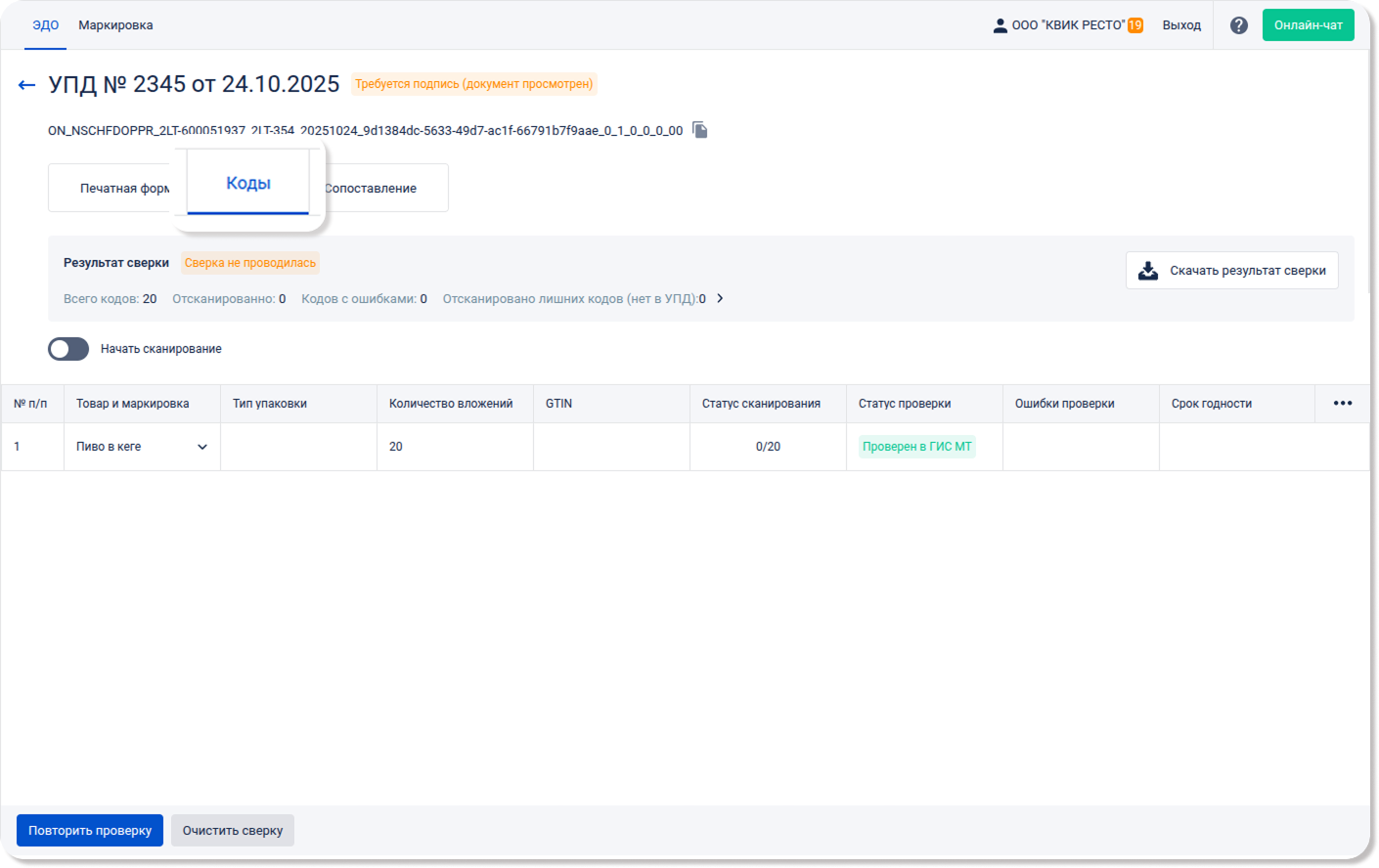 2. Коды. На данной панели вы можете просмотреть информацию о кодах маркировки, содержащихся в документе. Проверить их статус и провести сверку перед приемкой.