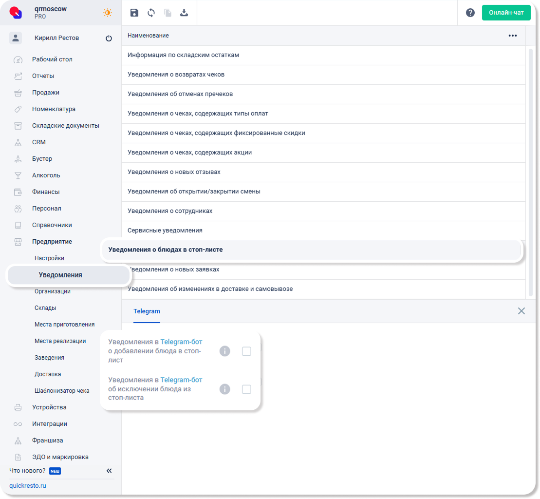 Для того чтобы всегда быть в курсе изменений в стоп-листе на кассовом терминале, настройте получение уведомлений в режиме реального времени. Для настройки перейдите в раздел Предприятие — Уведомления и выберите Уведомления о блюдах в стоп-листе.
