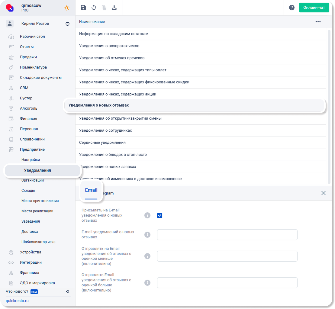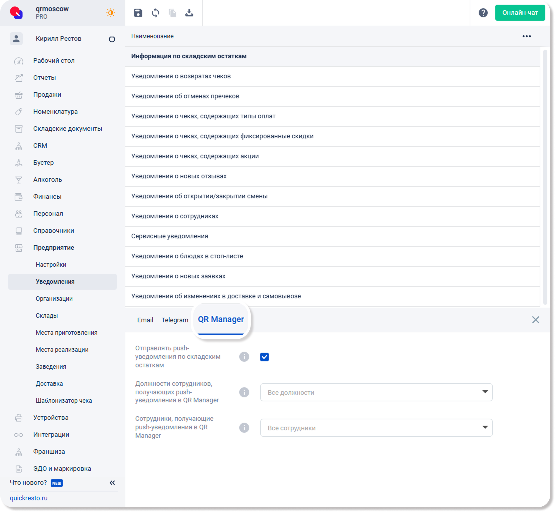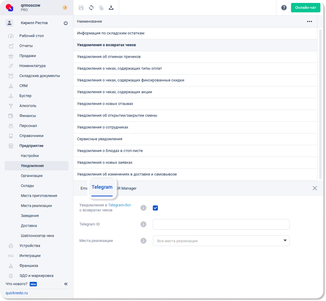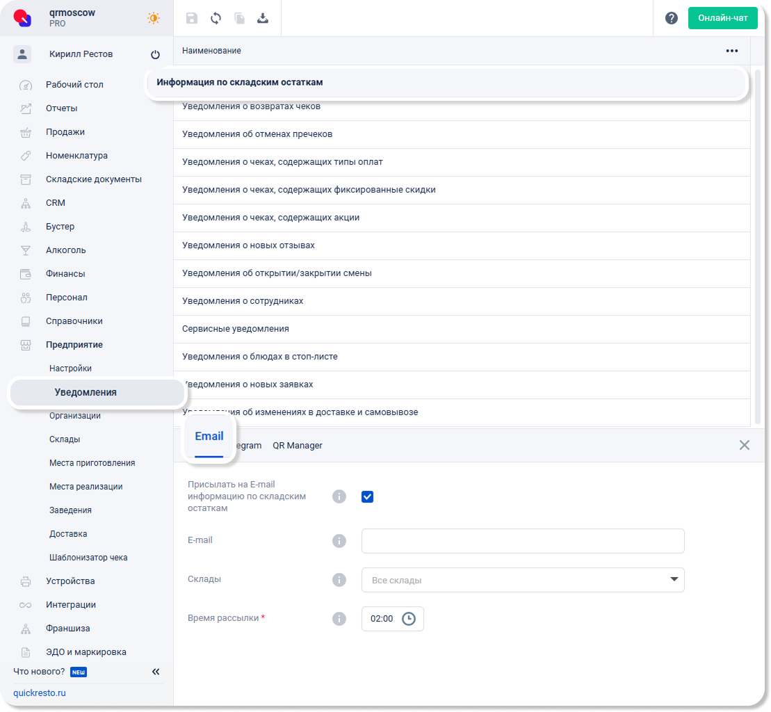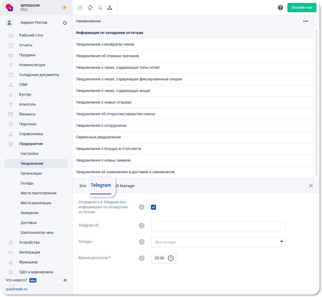 В разделе Предприятие — Уведомления можно настроить получение регулярных отчетов по складским остаткам, а также получение уведомлений в режиме реального времени о различных операциях с чеками, об открытии/закрытии смены, о новых отзывах из продуктов лояльности. Отчеты и уведомления можно получать на Email, в приложение QR Manager, а также в личные сообщения или в групповые чаты в мессенджер Telegram.