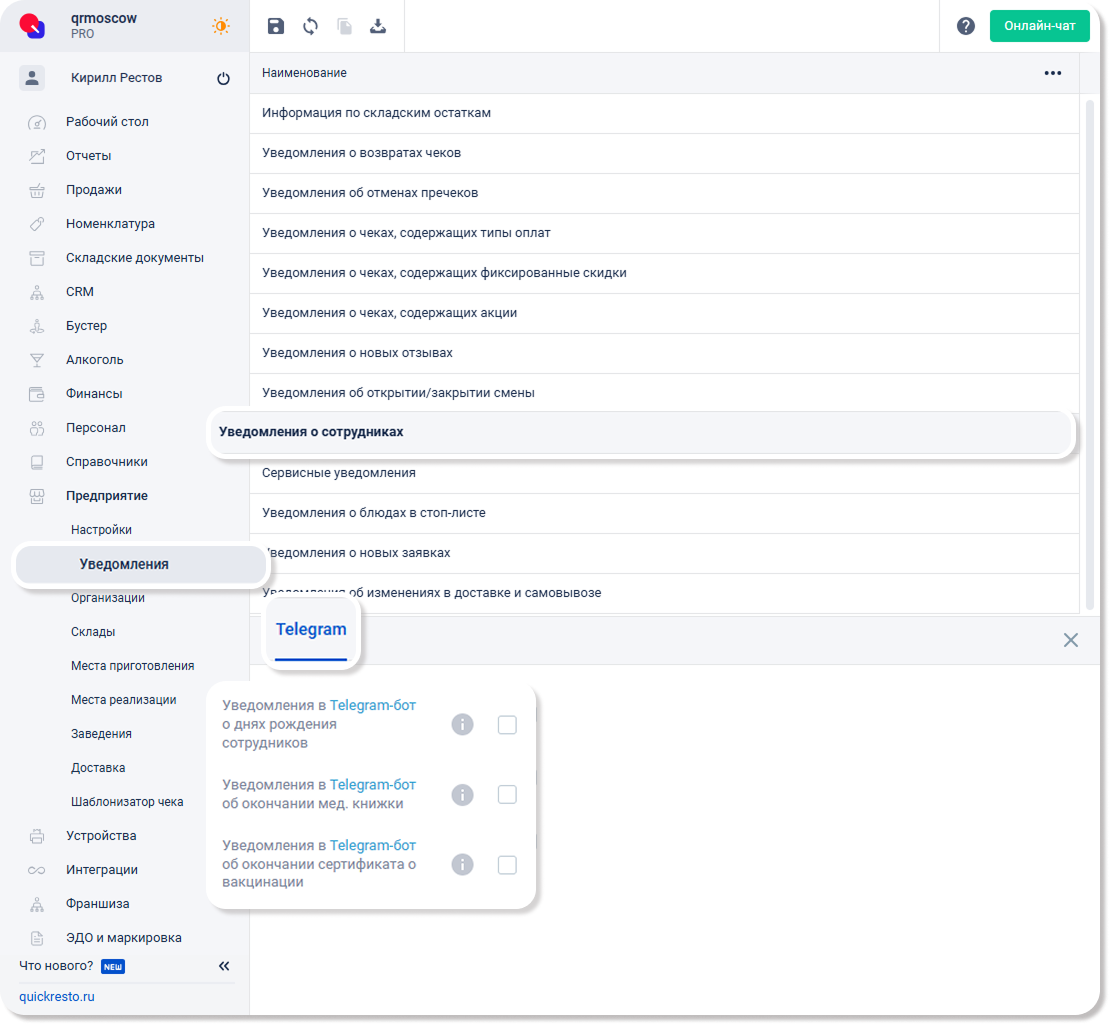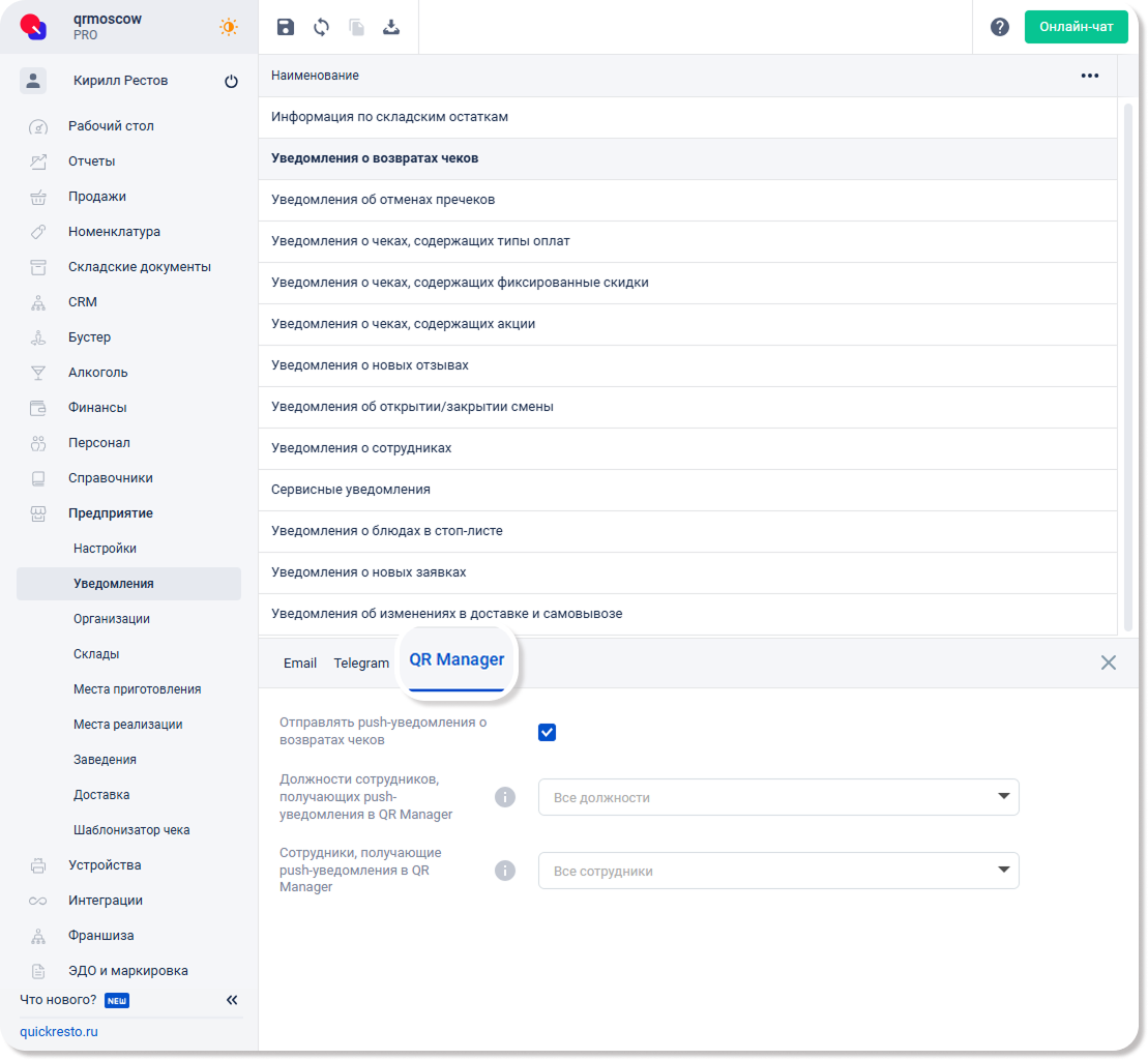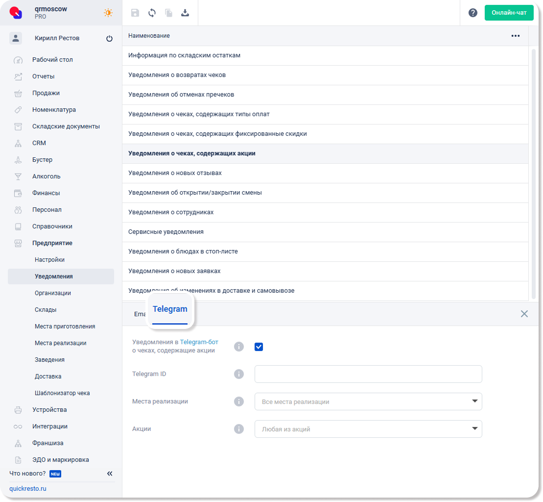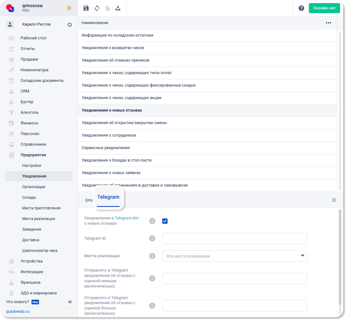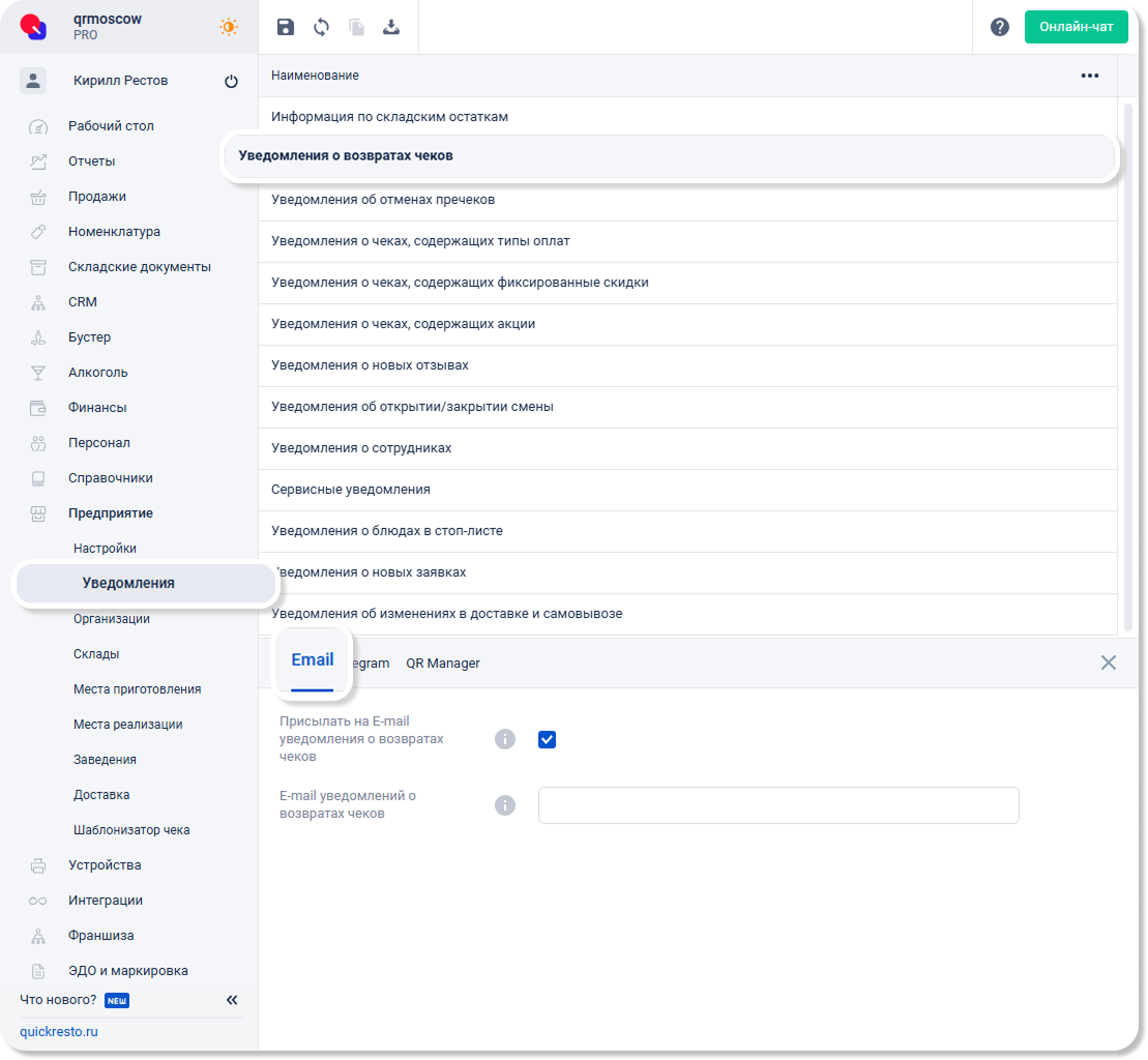 В разделе Предприятие — Уведомления можно настроить получение регулярных отчетов по складским остаткам, а также получение уведомлений в режиме реального времени о различных операциях с чеками, об открытии/закрытии смены, о новых отзывах из продуктов лояльности. Отчеты и уведомления можно получать на Email, в приложение QR Manager, а также в личные сообщения или в групповые чаты в мессенджер Telegram.