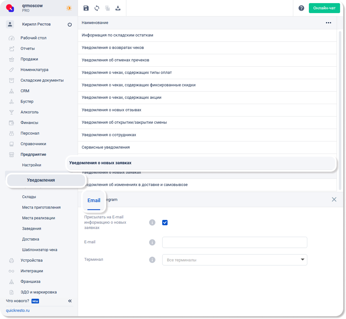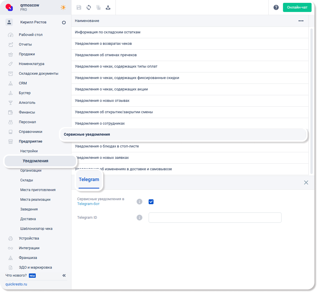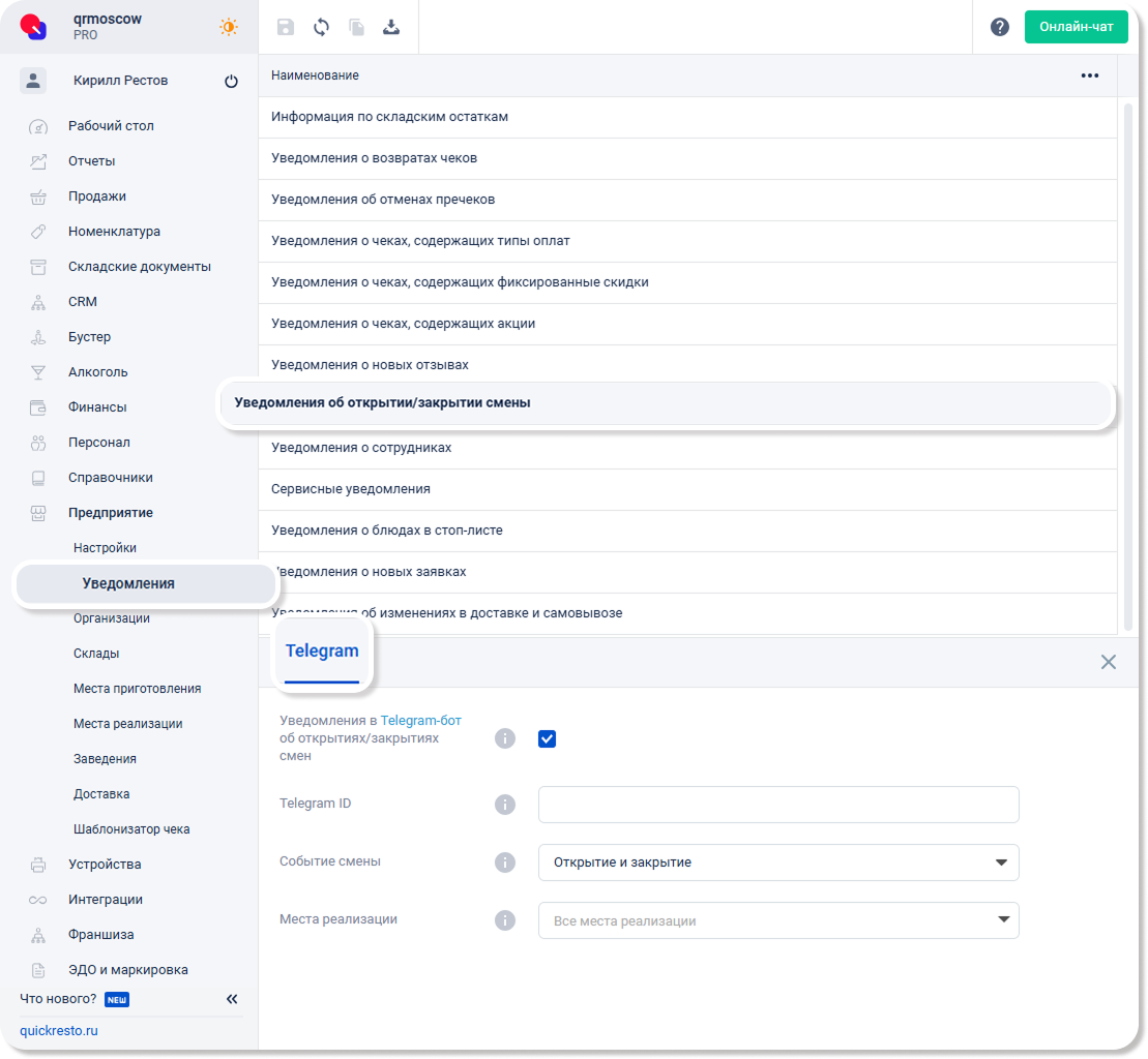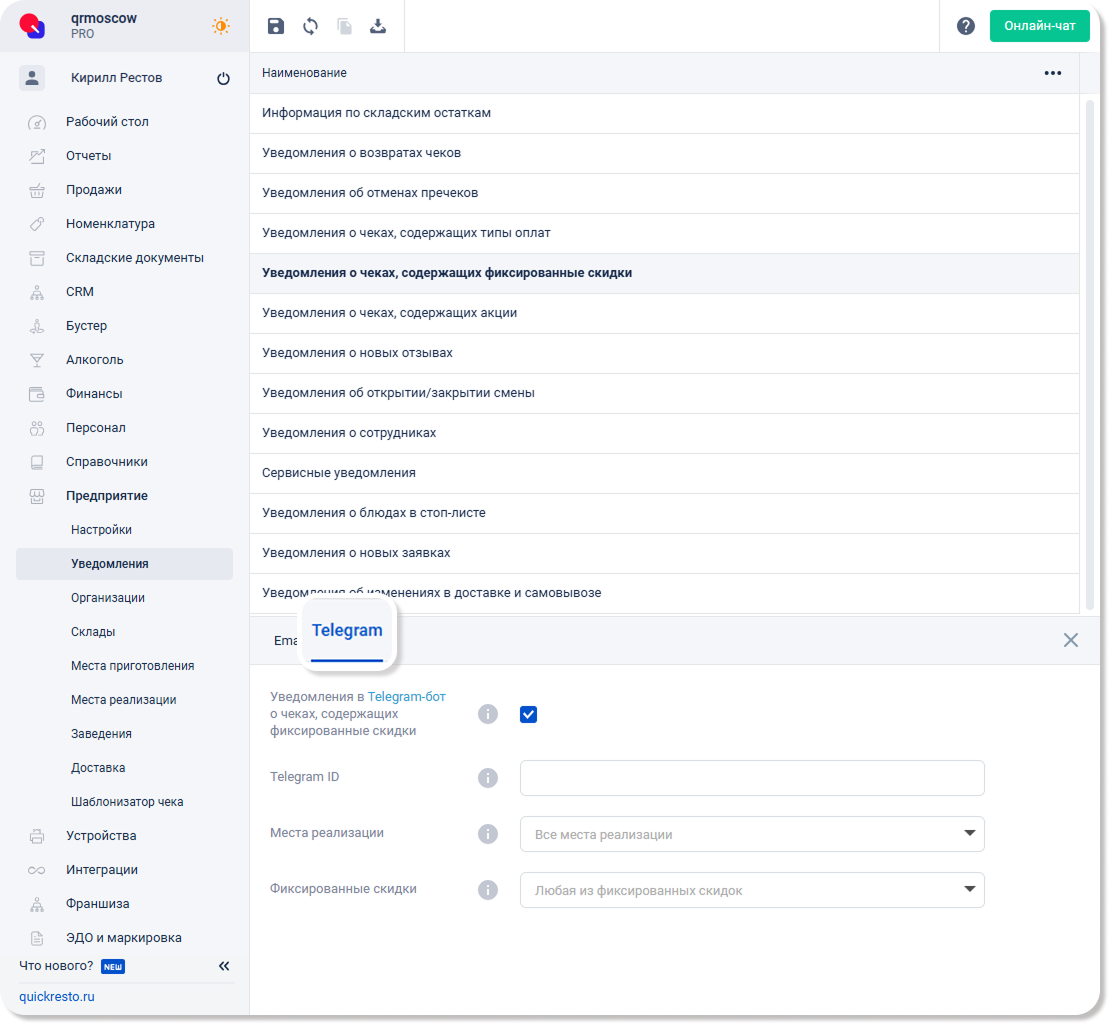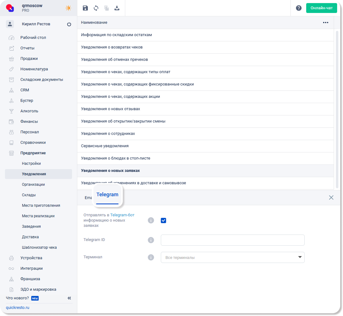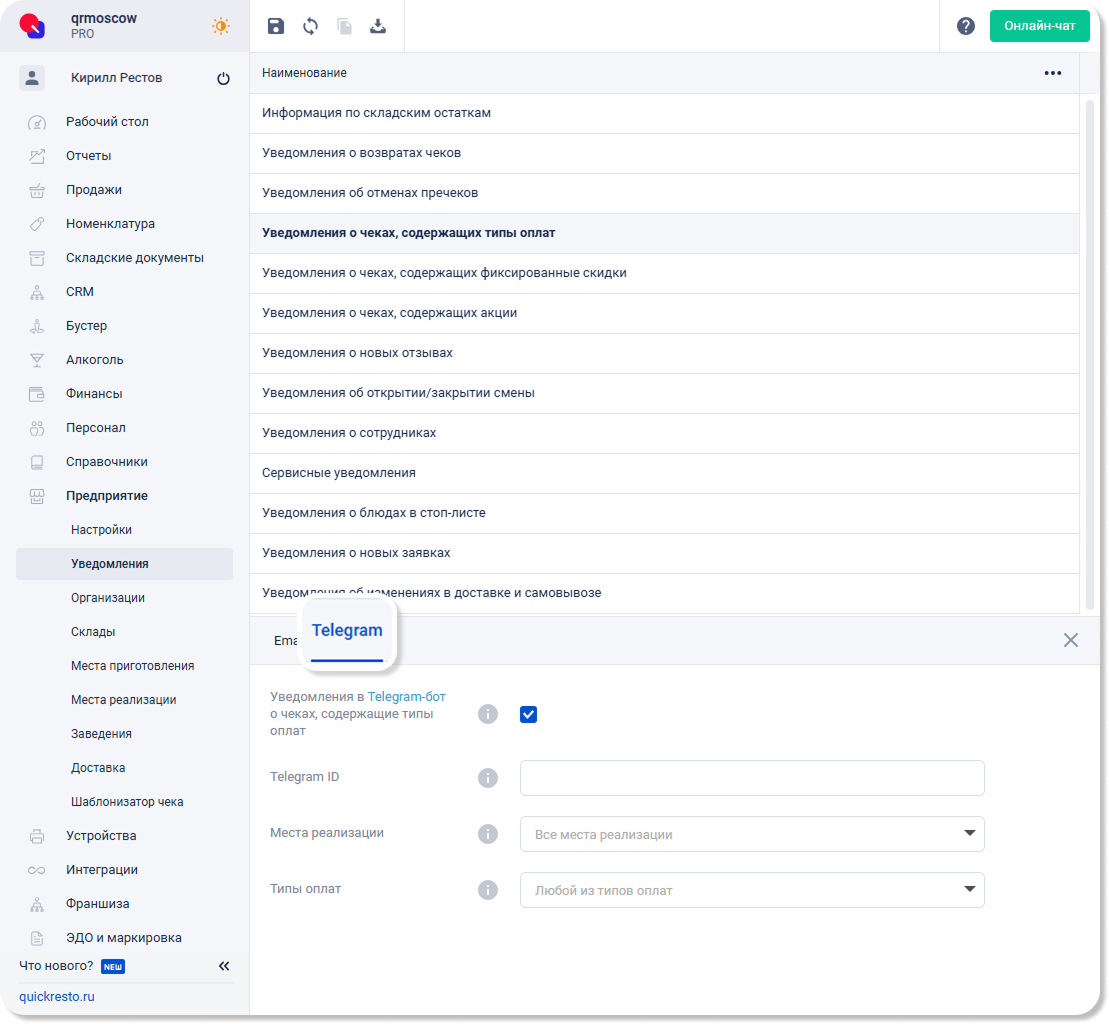 В разделе Предприятие — Уведомления можно настроить получение регулярных отчетов по складским остаткам, а также получение уведомлений в режиме реального времени о различных операциях с чеками, об открытии/закрытии смены, о новых отзывах из продуктов лояльности. Отчеты и уведомления можно получать на Email, в приложение QR Manager, а также в личные сообщения или в групповые чаты в мессенджер Telegram.
