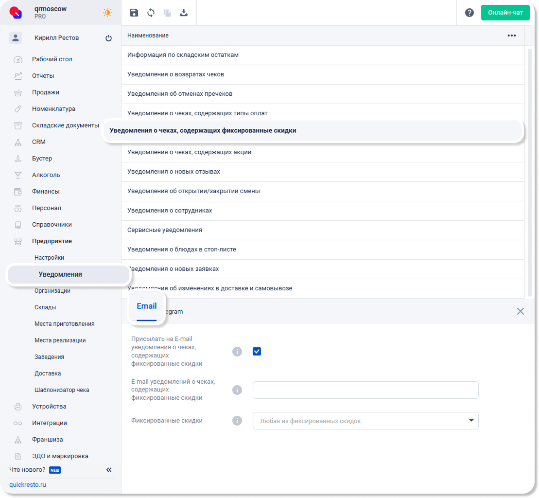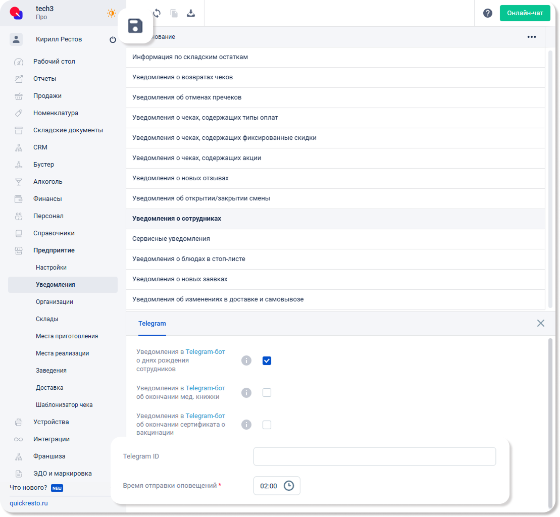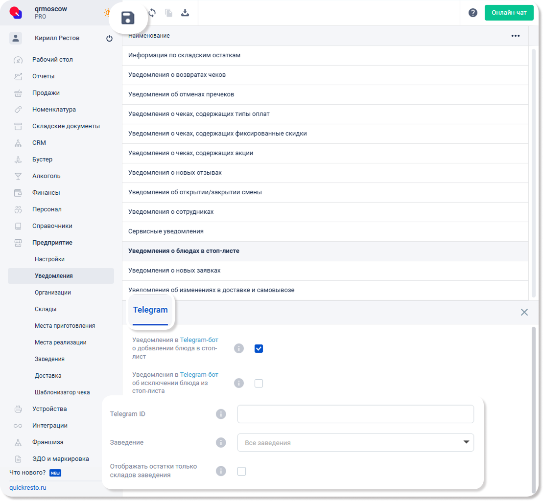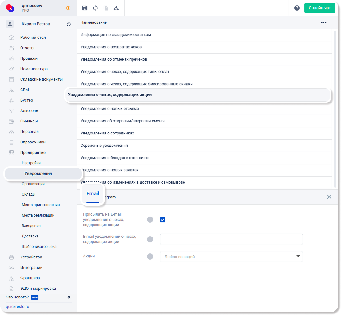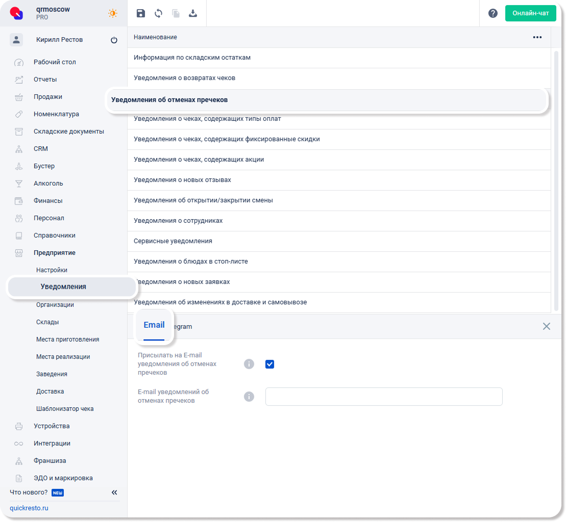 В разделе Предприятие — Уведомления можно настроить получение регулярных отчетов по складским остаткам, а также получение уведомлений в режиме реального времени о различных операциях с чеками, об открытии/закрытии смены, о новых отзывах из продуктов лояльности. Отчеты и уведомления можно получать на Email, в приложение QR Manager, а также в личные сообщения или в групповые чаты в мессенджер Telegram.