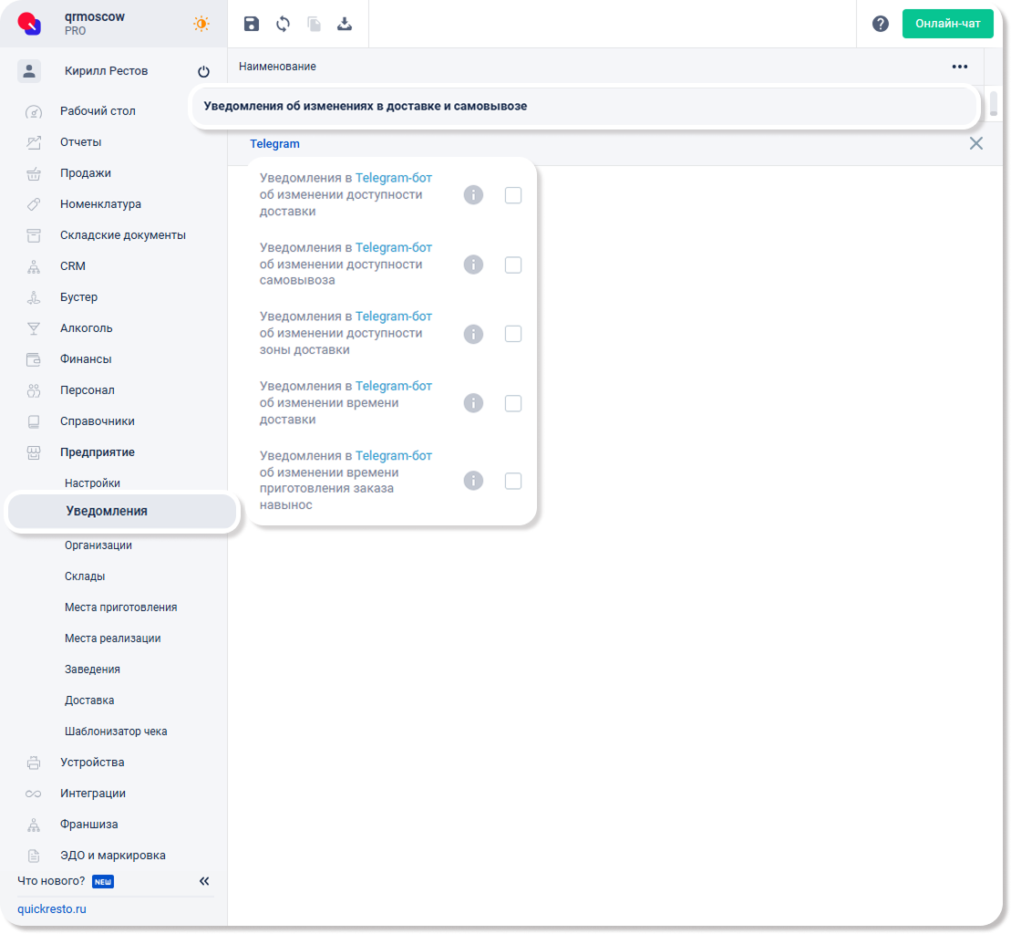 Для того чтобы контролировать изменения времени и доступности доставки и самовывоза, настройте получение уведомлений в режиме реального времени. Для настройки перейдите в раздел Предприятие — Уведомления и выберите Уведомления об изменениях в доставке и самовывозе.