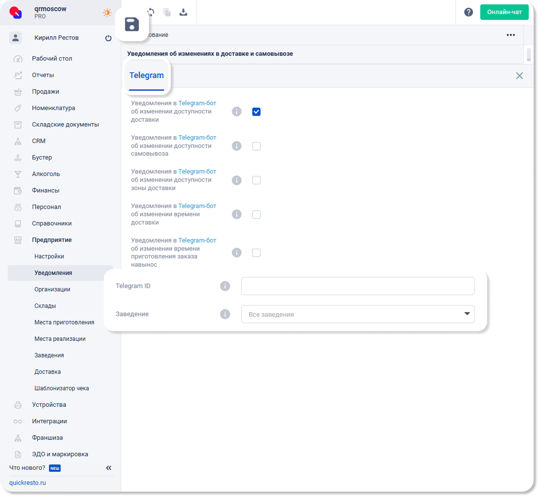 Например, если активировать флаг в поле Уведомления в Telegram-бот об изменении доступности доставки, то при каждом включении или отключении опции доставки на кассовом терминале на указанные Telegram ID будут автоматически приходить сообщения.