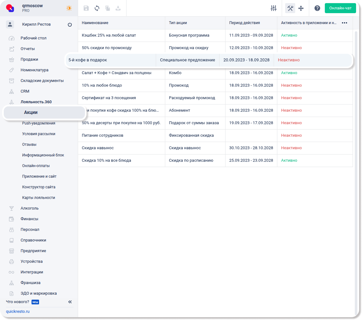 Все акции, созданные в разделе бэк-офиса CRM — Акции, отображаются также и в разделе Лояльность.360 — Акции.