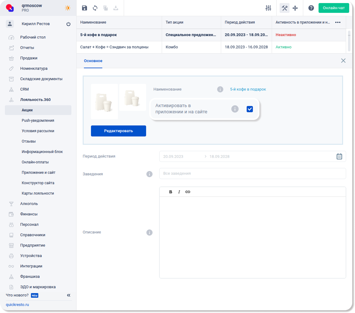 2. Откроется редактор акции. Активируйте флаг в поле Активировать в приложении и на сайте. Данный параметр определяет активна ли акция в приложении для гостей и на сайте заведения.