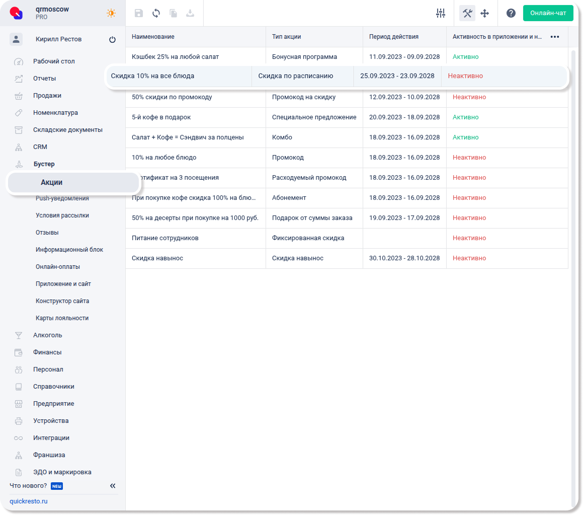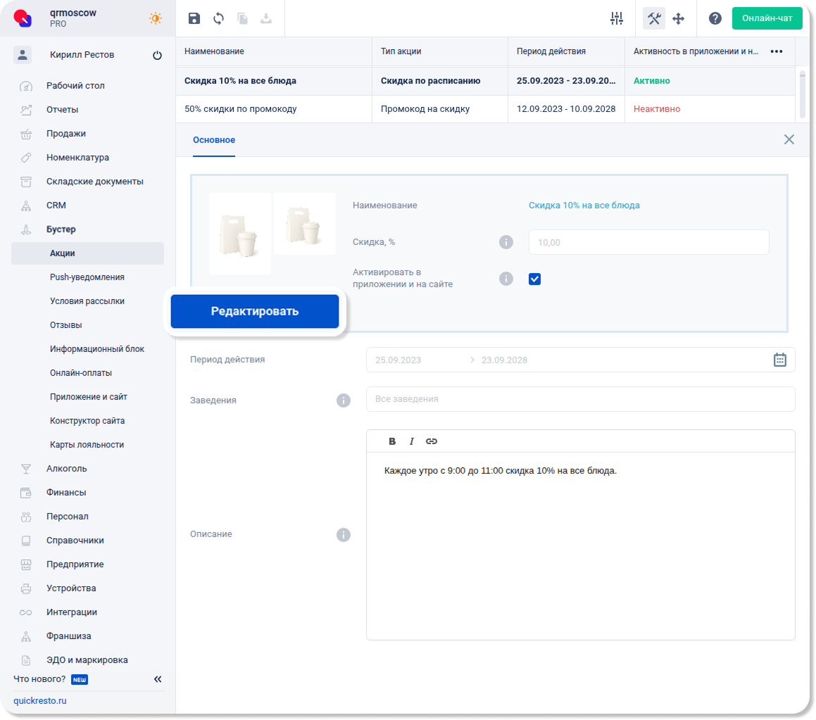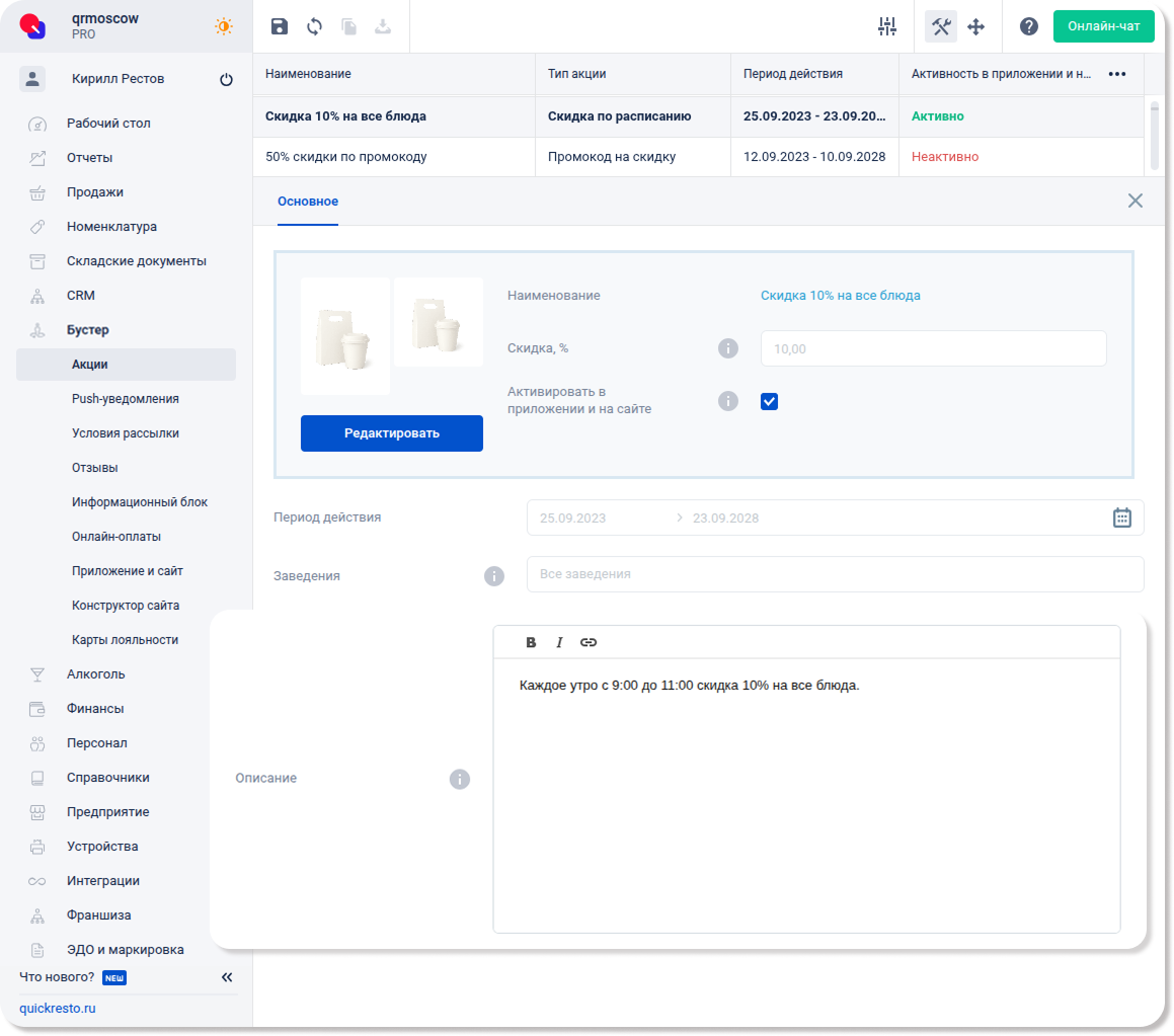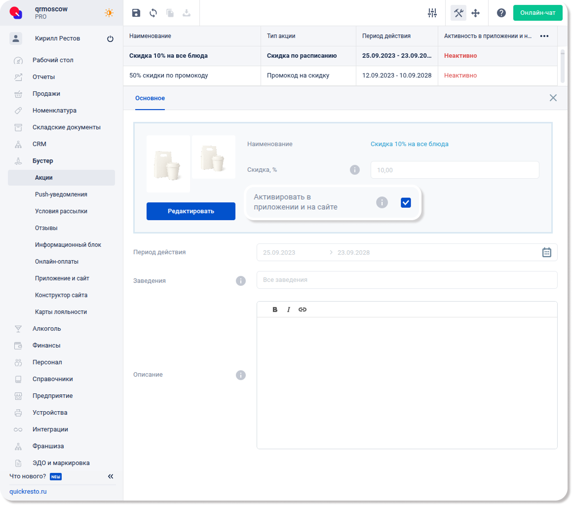 Скидки, созданные в разделе CRM — Скидки, также отображаются в разделе Бустер — Акции.