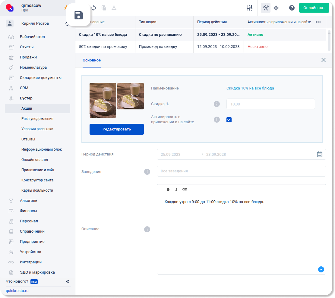 1. В поле Описание укажите описание скидки. Например, «Каждое утро с 9:00 до 11:00 скидка 10% на все блюда.».