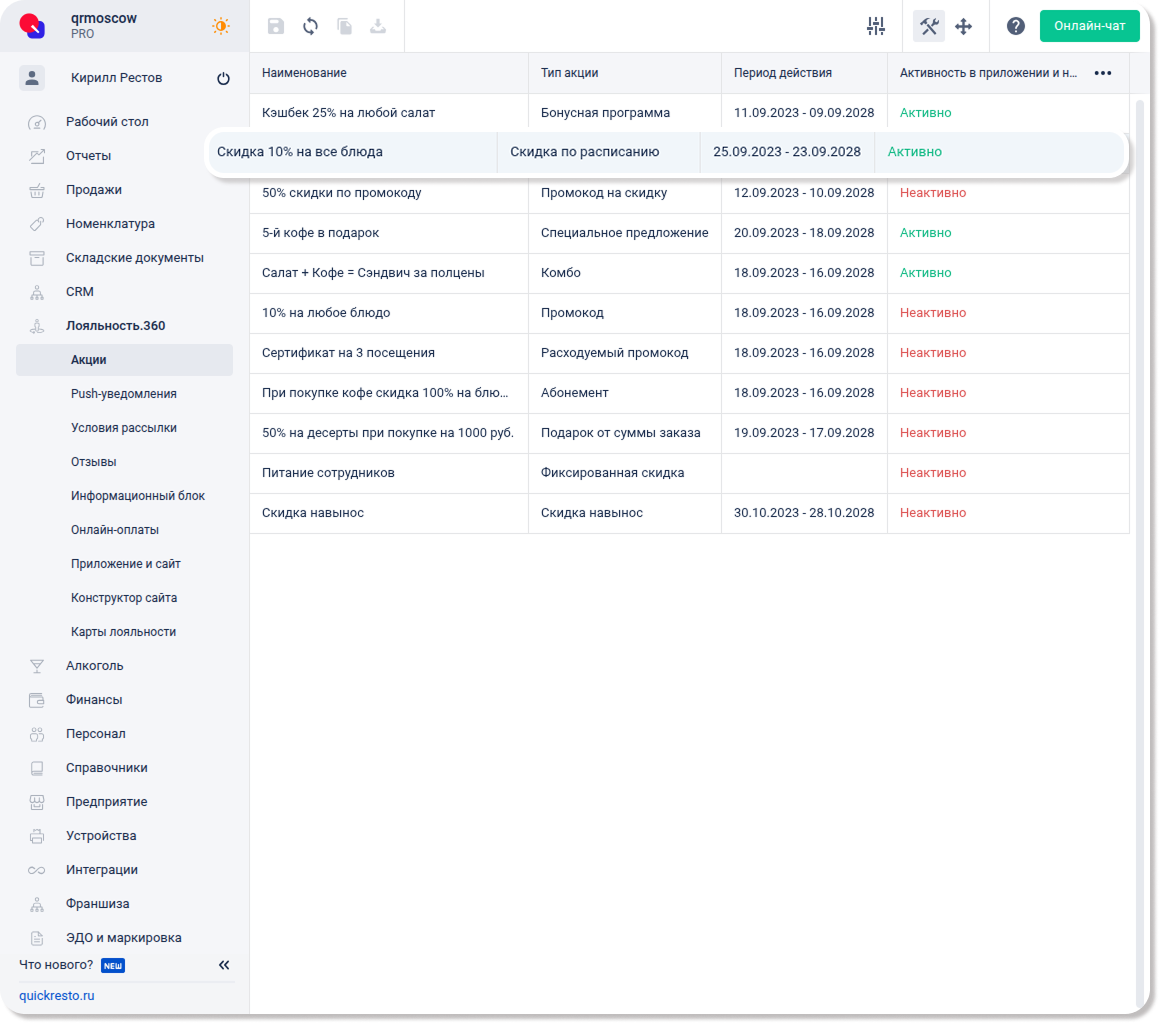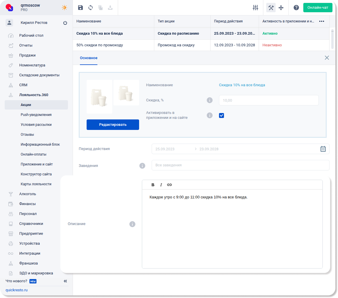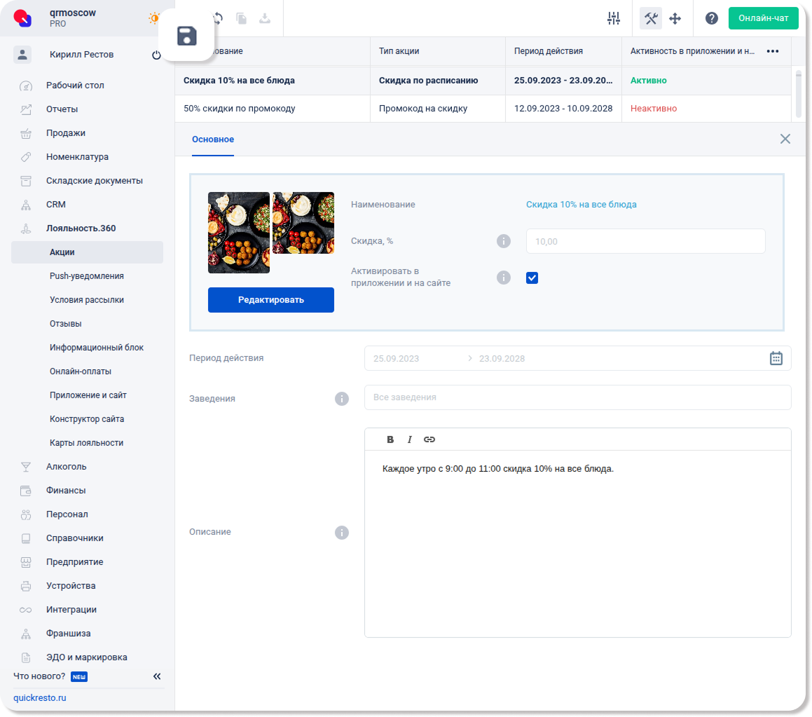 Для этого создайте скидку в разделе CRM, затем перейдите в раздел Лояльность.360 — Акции и выполните следующие действия: