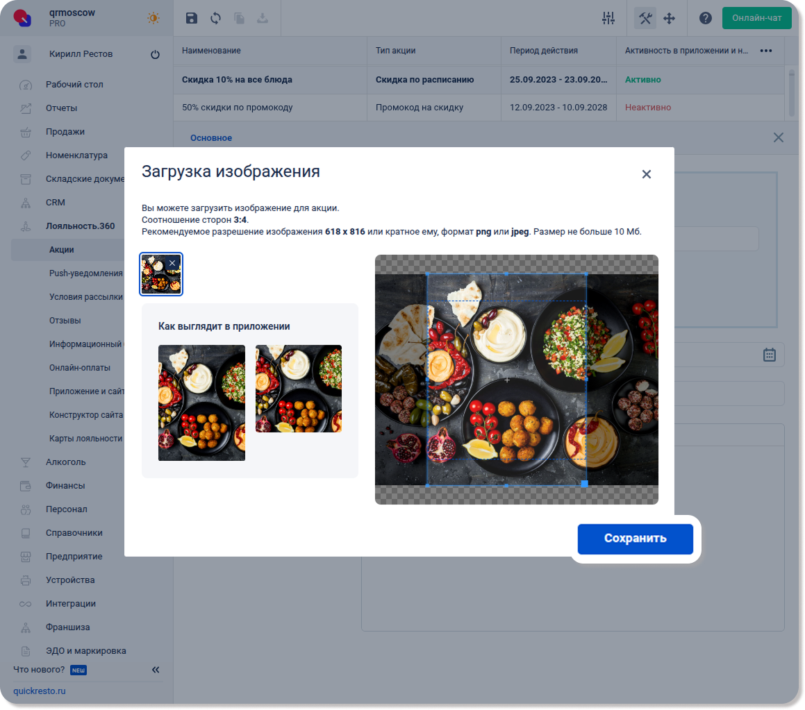 Скидки, созданные в разделе CRM — Скидки, также отображаются в разделе Лояльность.360 — Акции. Чтобы скидка была активна и активно было ее изображение в мини-приложении Telegram-бота, необходимо сделать определённые настройки.
