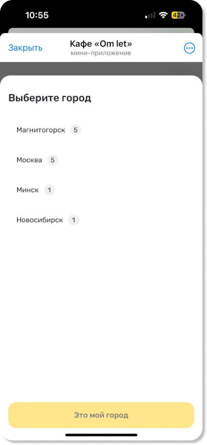 Нажав на поле с названием города, можно увидеть количество заведений в другом городе и выбрать нужный вариант.